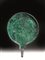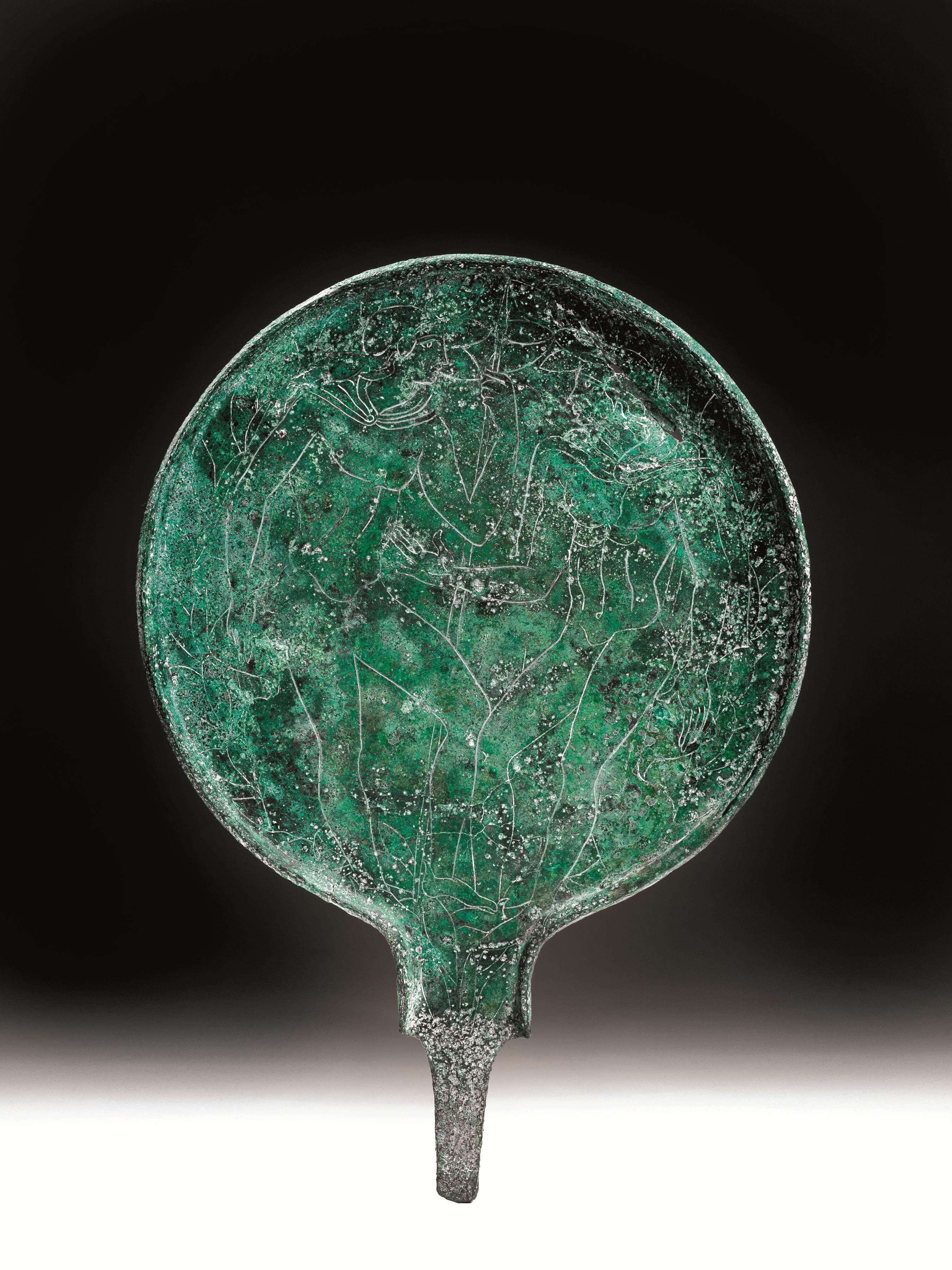 Specchio a disco con manico a verga sagomato. Dalla parte specchiante presenta sul bordo una fitta perlinatura e una palmetta aperta sopra al codolo d’innesto nel manico.