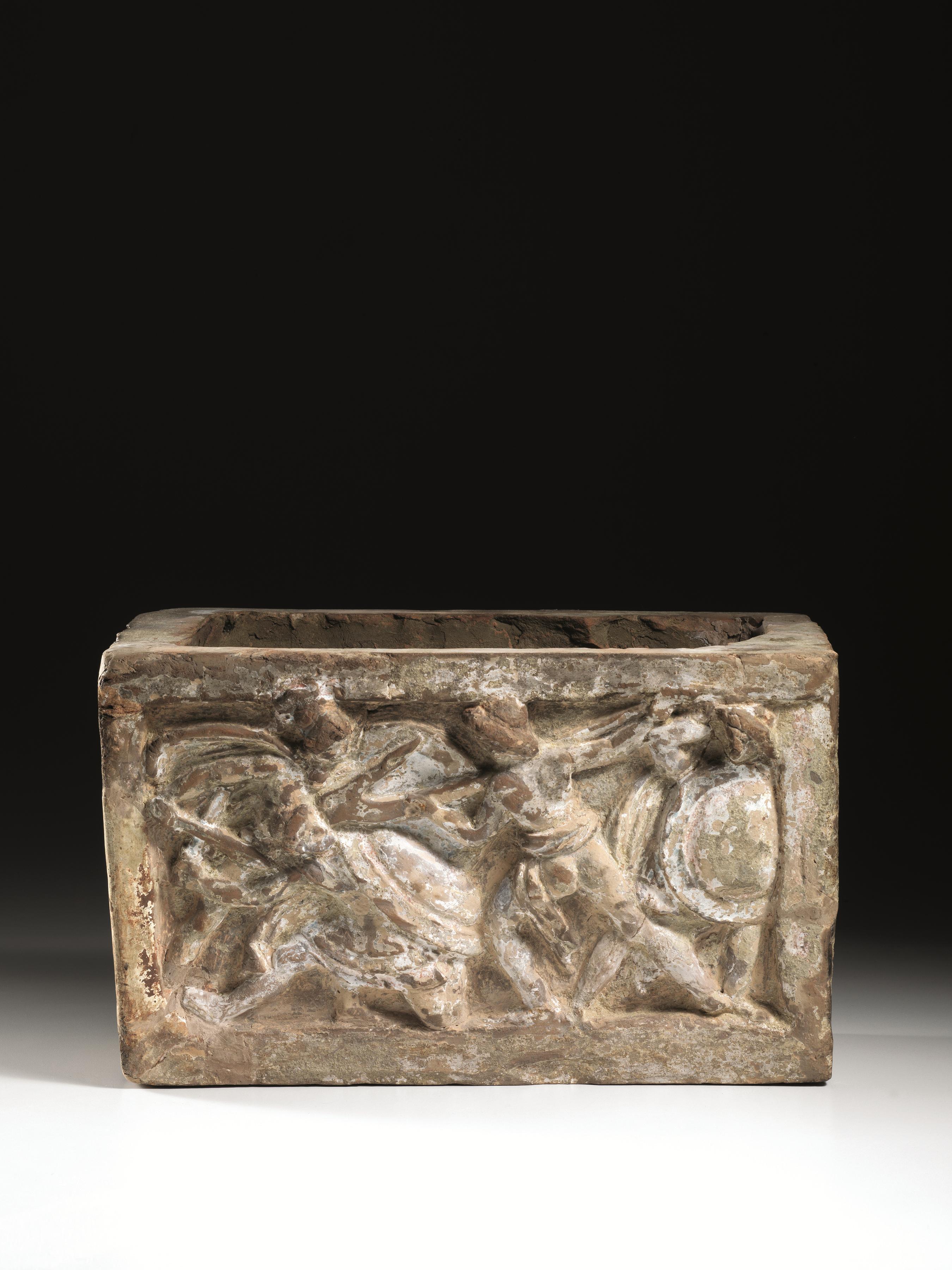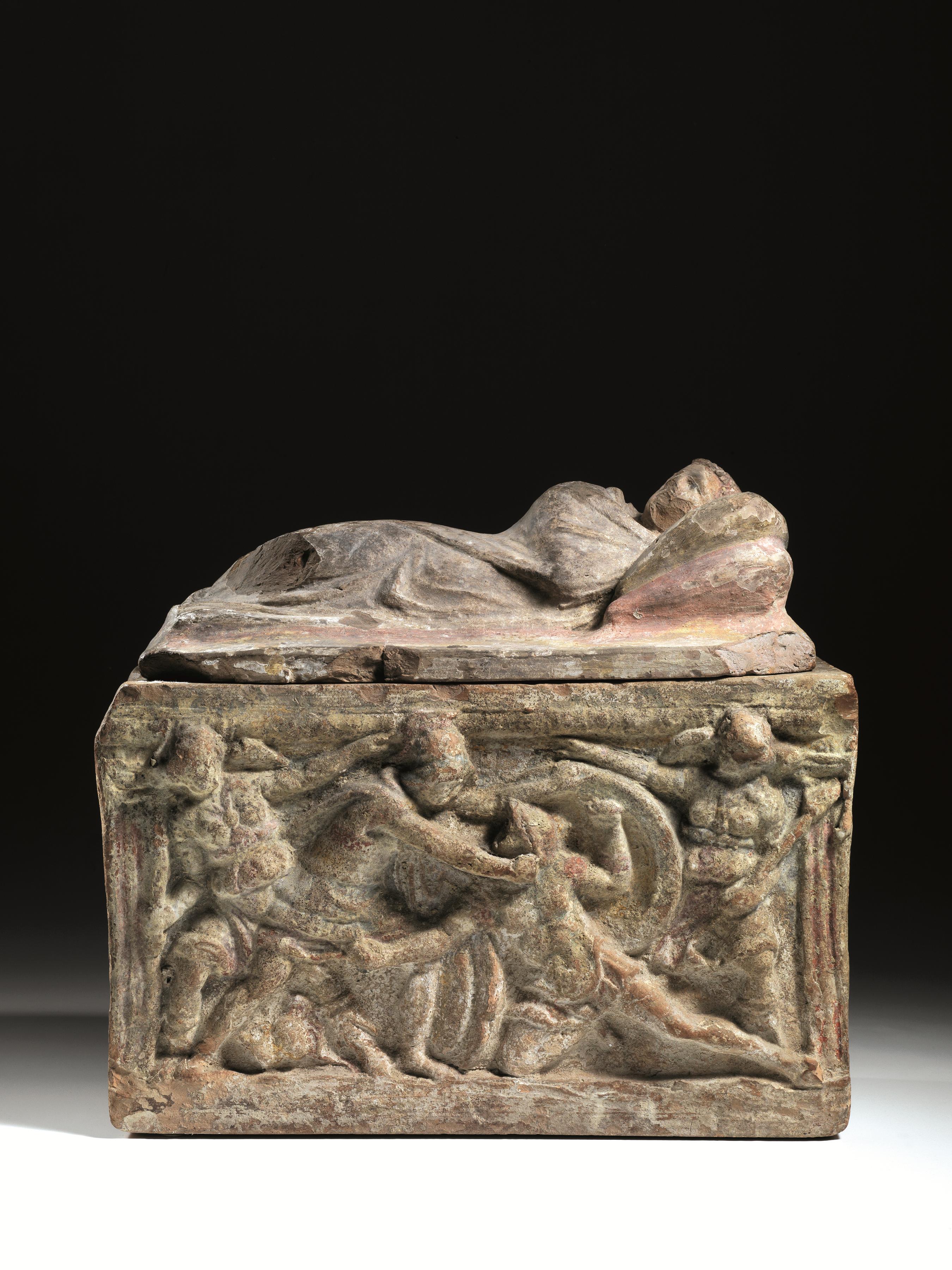 La cassa di forma parallelepipeda è decorata sul fronte col mito etrusco dell’eroe che combatte con l’aratro; al centro un uomo in nudità eroica, con la clamide cinta attorno ai fianchi, volto a destra, abbatte col timone di un aratro un guerriero; questi, già caduto, è coperto dal grande scudo rotondo che usa per difendersi assieme alla spada impugnata nella mano destra; completano la scena su ciascun lato figure di guerrieri con elmo, spada e grande scudo, in atto di avanzare contro l’eroe centrale.