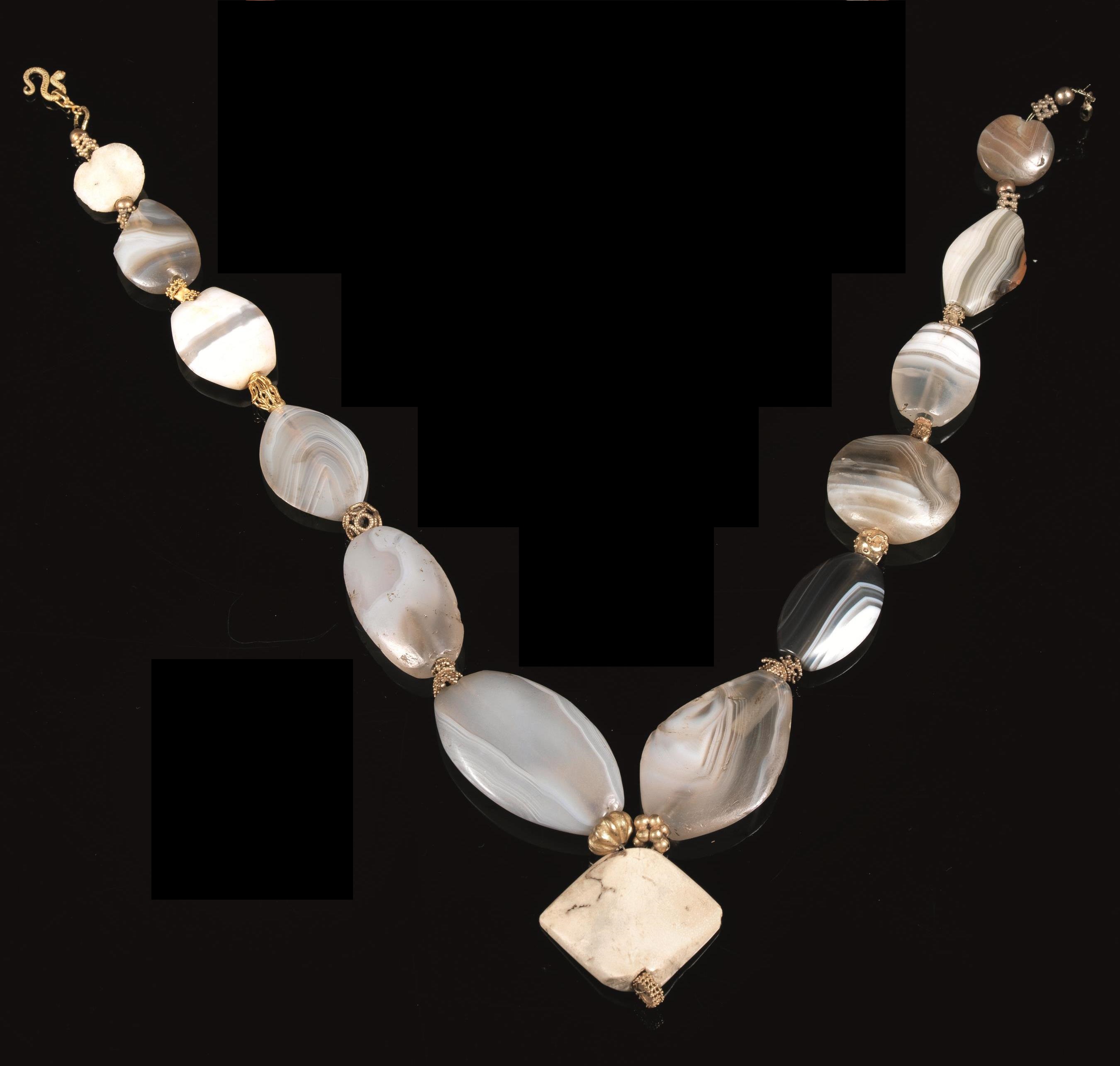 Collana formata da tredici vaghi di forma ellittica e quadrangolare in agata sardonice striata, alternati a piccoli elementi in filigrana d’oro, completa di fermatura moderna in oro
