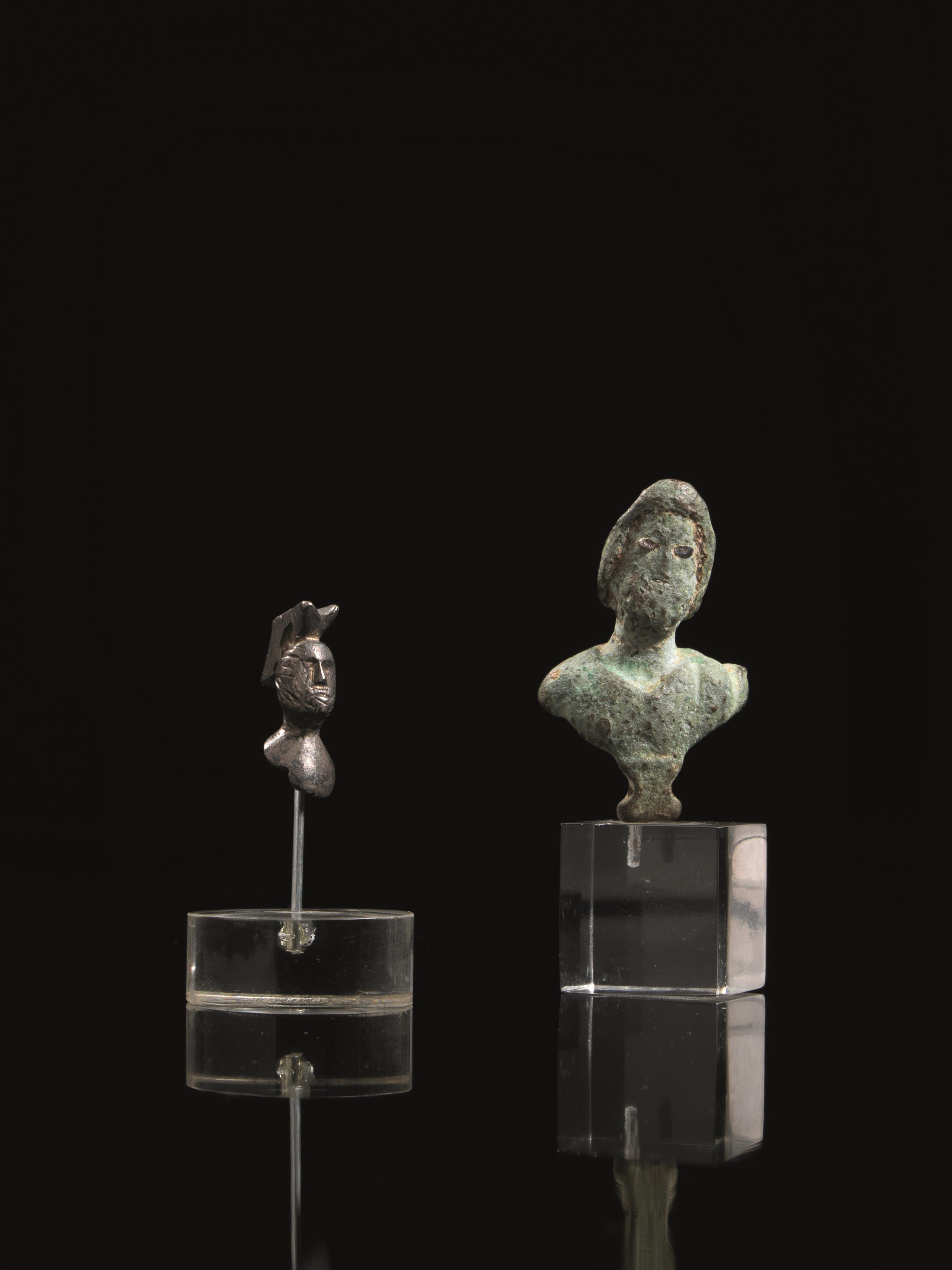 Un piccolo busto di Zeus panneggiato con folta barba e occhi in argento ed un piccolo busto maschile elmato con piccole incisioni a indicare la barba (2)