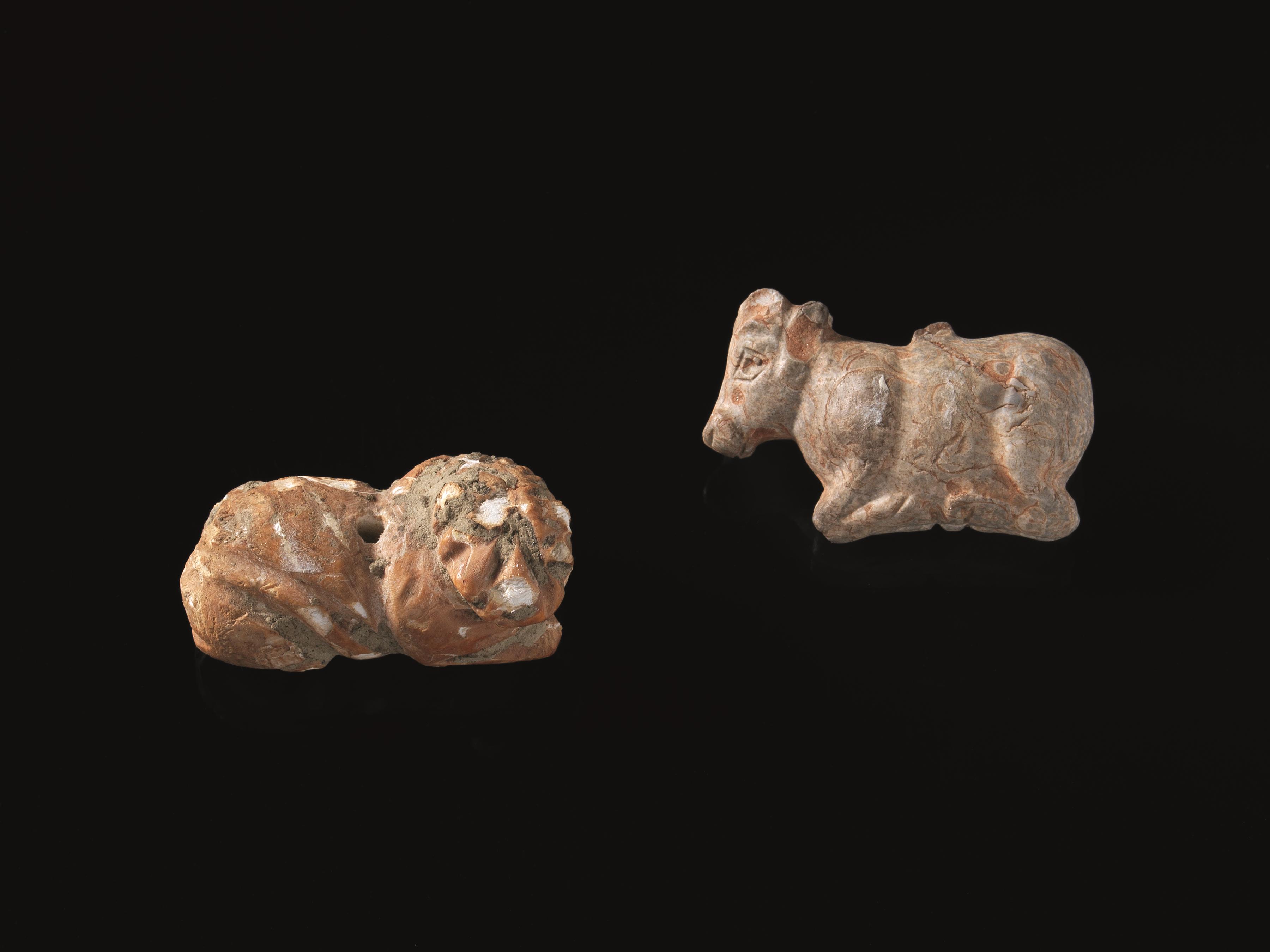 DUE PENDENTI Materia e tecnica: calcare Un bovide accucciato realisticamente...