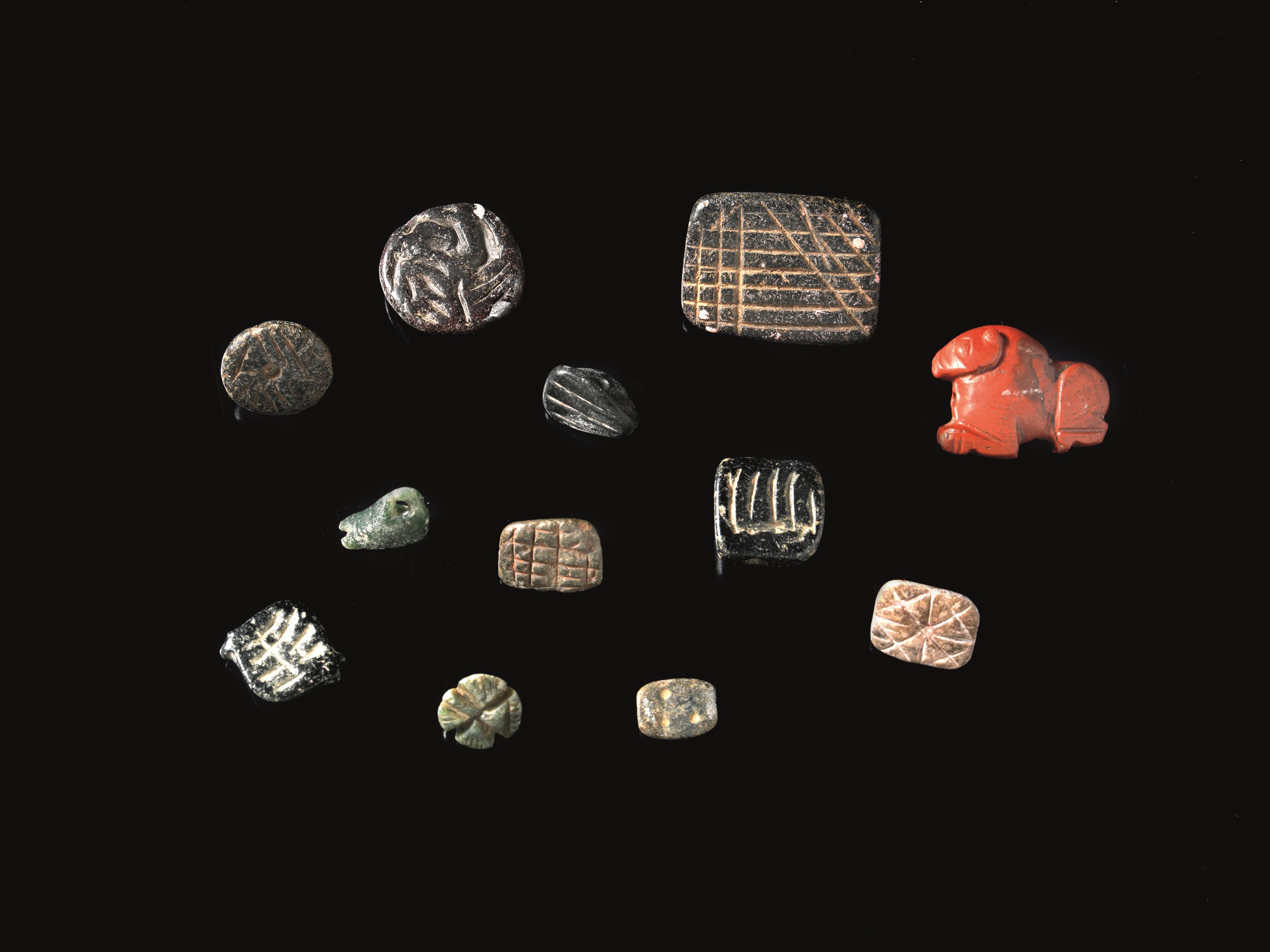 Undici pendenti a sigillo di forma quadrangolare e circolare decorati a motivi geometrici e un leoncino accucciato di glittica di Uruk in diaspro rosso con foro longitudinale per la sospensione (12)
