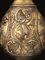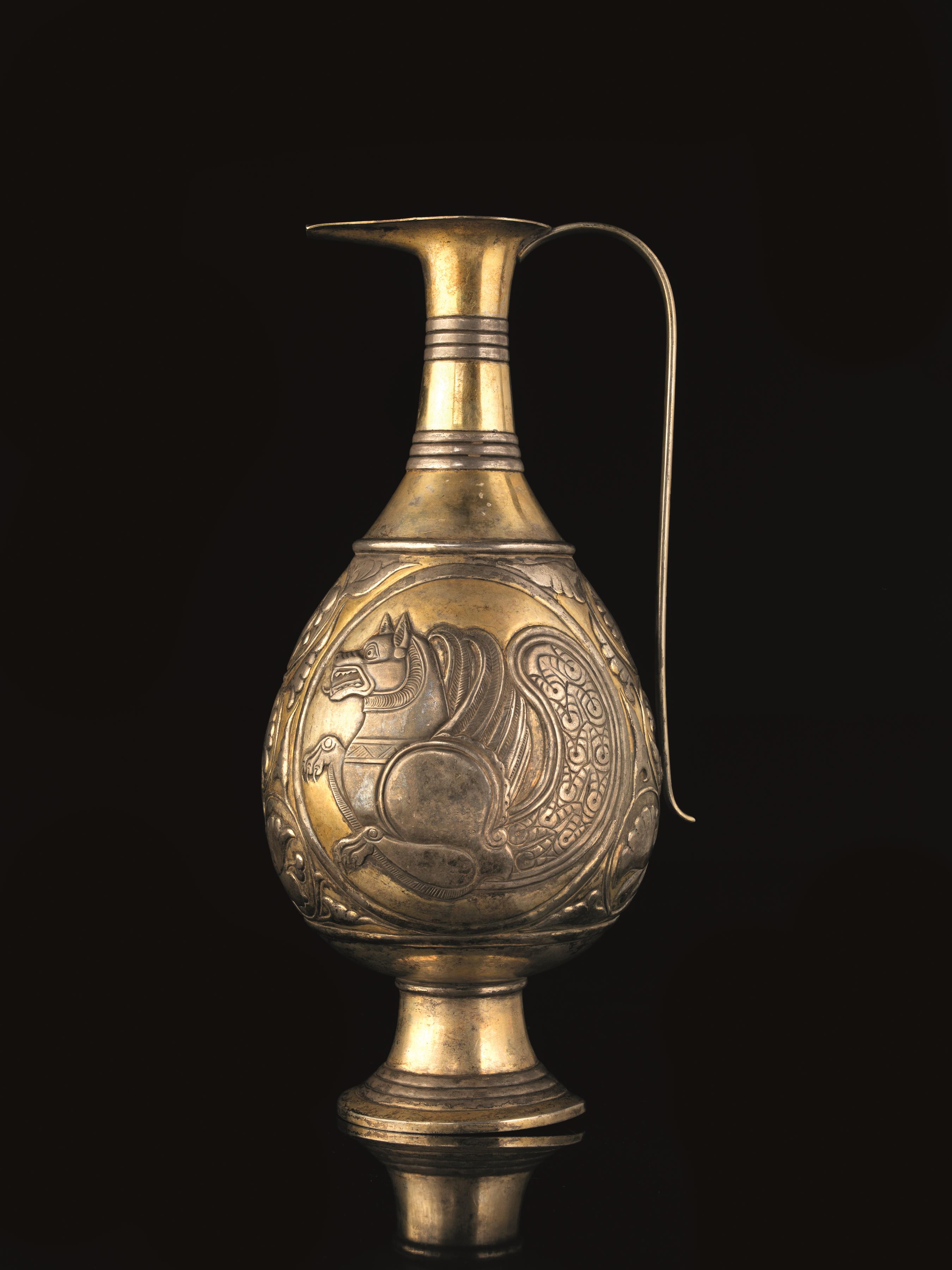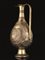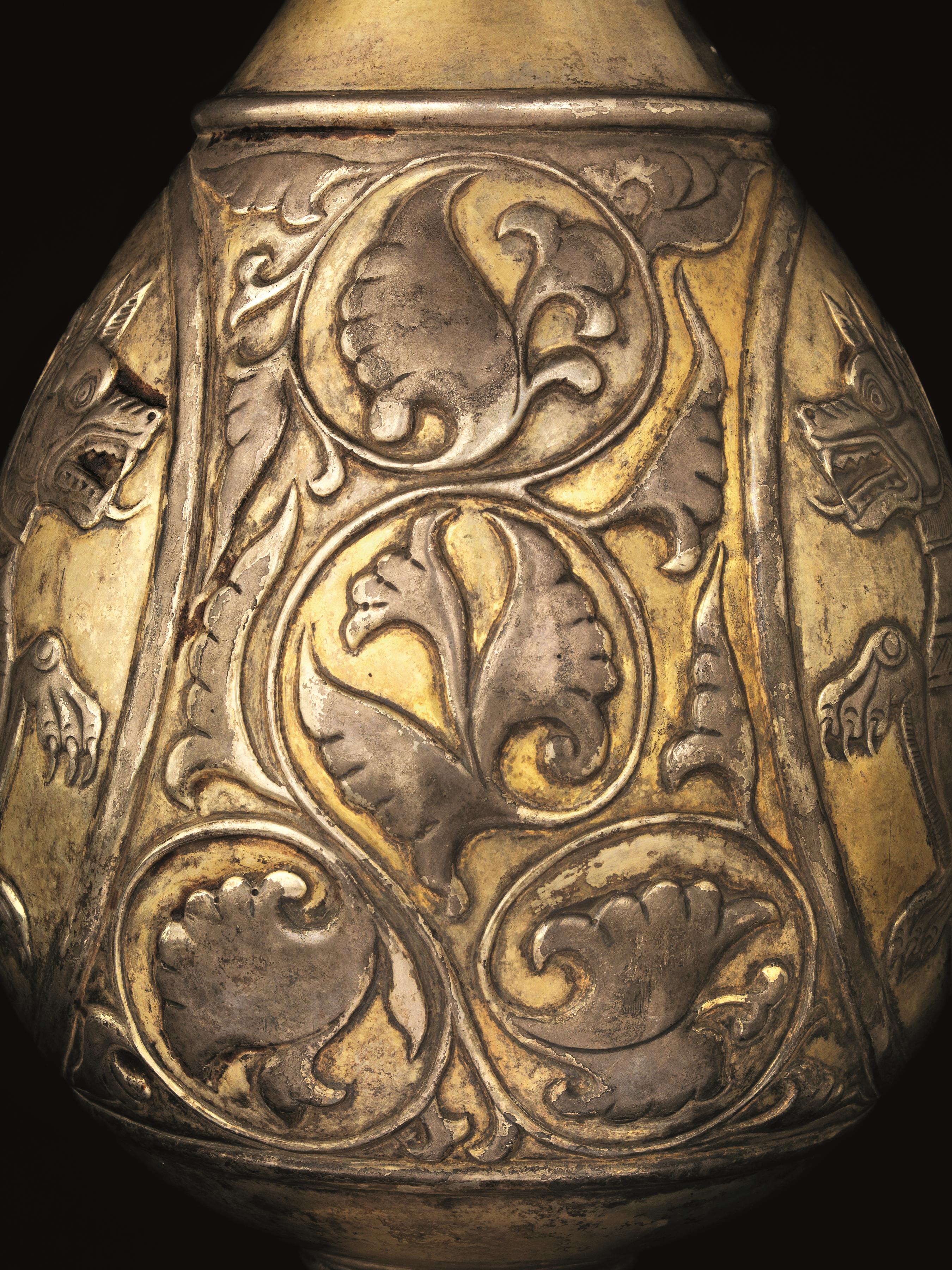Decorazione: sul collo e sul piede due gruppi di anelli plastici orizzontali in argento naturale, corpo interamente decorato a sbalzo con due medaglioni circolari raffiguranti il Senmurv , cane-pavone della mitologia iranica alternati a girali e volute floreali e fitomorfe. L’apparato decorativo è interamente giocato sull’alternanza cromatica tra le parti in argento naturale e quelle dorate.