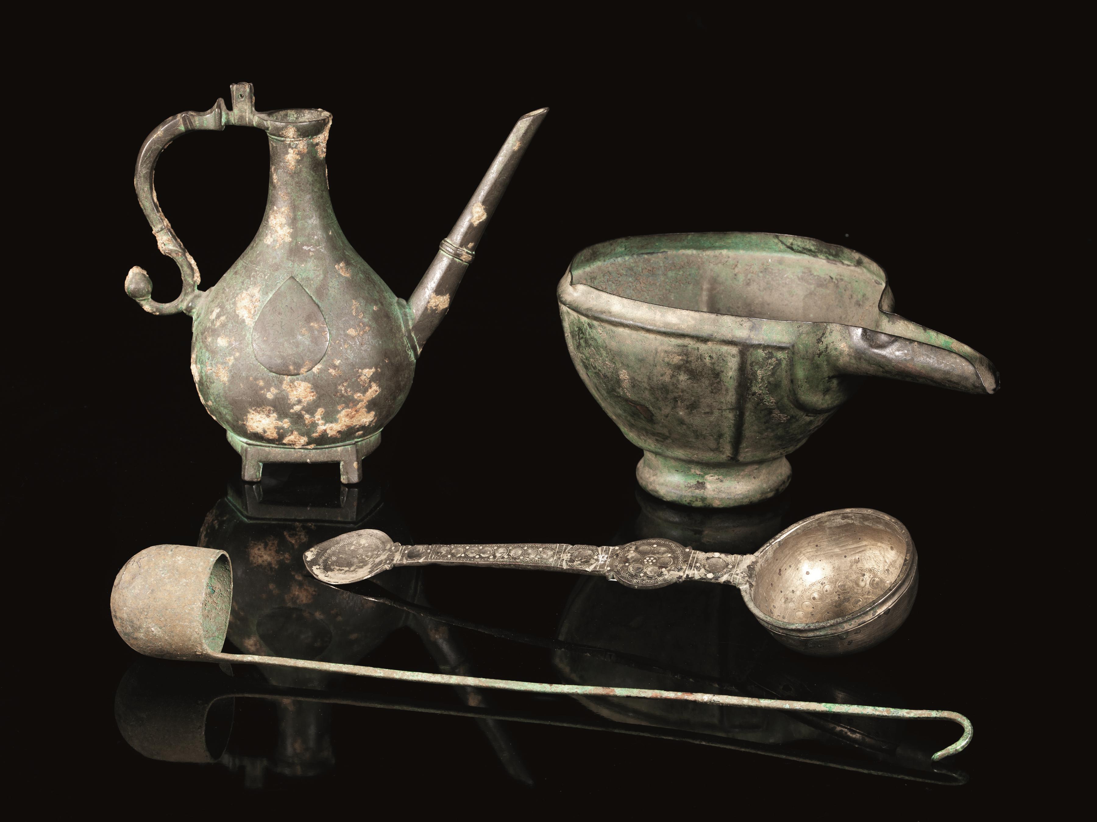 Bacile in lamina di bronzo con bordo rientrante, vasca troncoconica decorata da costolature in rilievo, piede circolare e ampio becco allungato sul bordo; versatoio in forma di fiasca con il corpo fittamente decorato da motivo fogliaceo, ansa a voluta, base esagonale su quattro piedi cilindrici e lungo becco impostato obliquamente; grande mestolo in bronzo argentato con estremità a foglia stilizzata e coppa emisferica fittamente decorato con cerchielli e coppelle; attingitoio con lungo manico in verga di bronzo quadrangolare e vasca cilindrica (4)