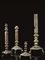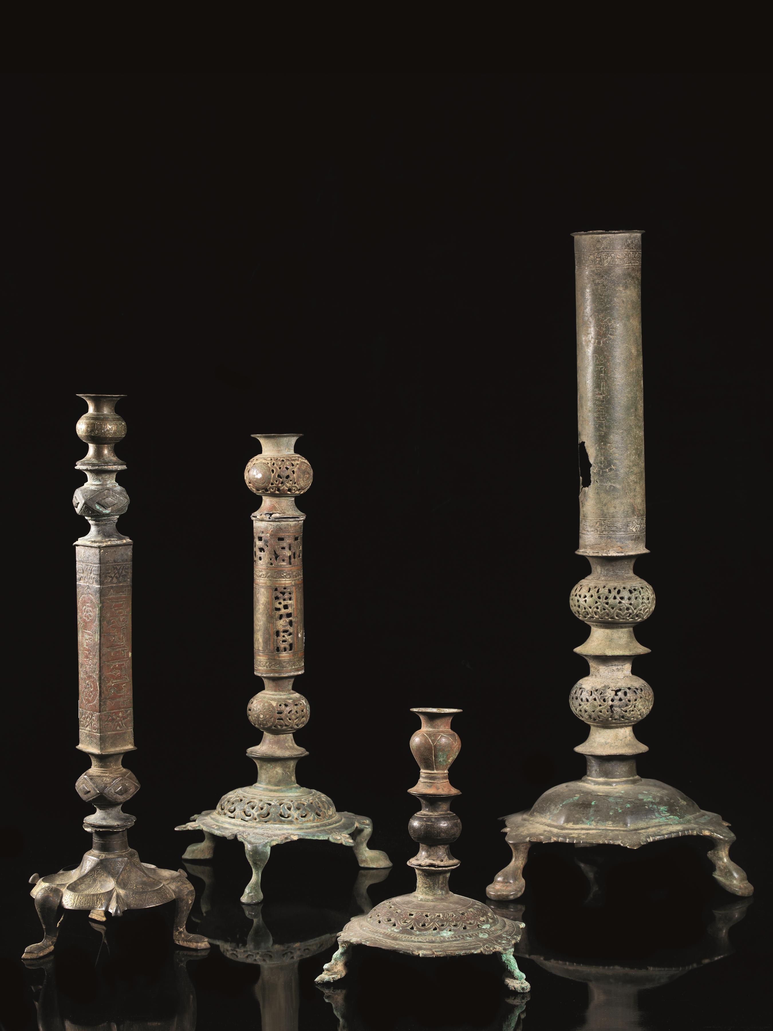 Candelieri con fusto cilindrico, decorato con trafori di tipo geometrico e iscrizioni in cufico fiorito e con nodi ed ingrossamenti in forma di vaso stilizzato con basi polilobate decorate in maniera analoga su tre piedi in foggia animale stilizzata (4)