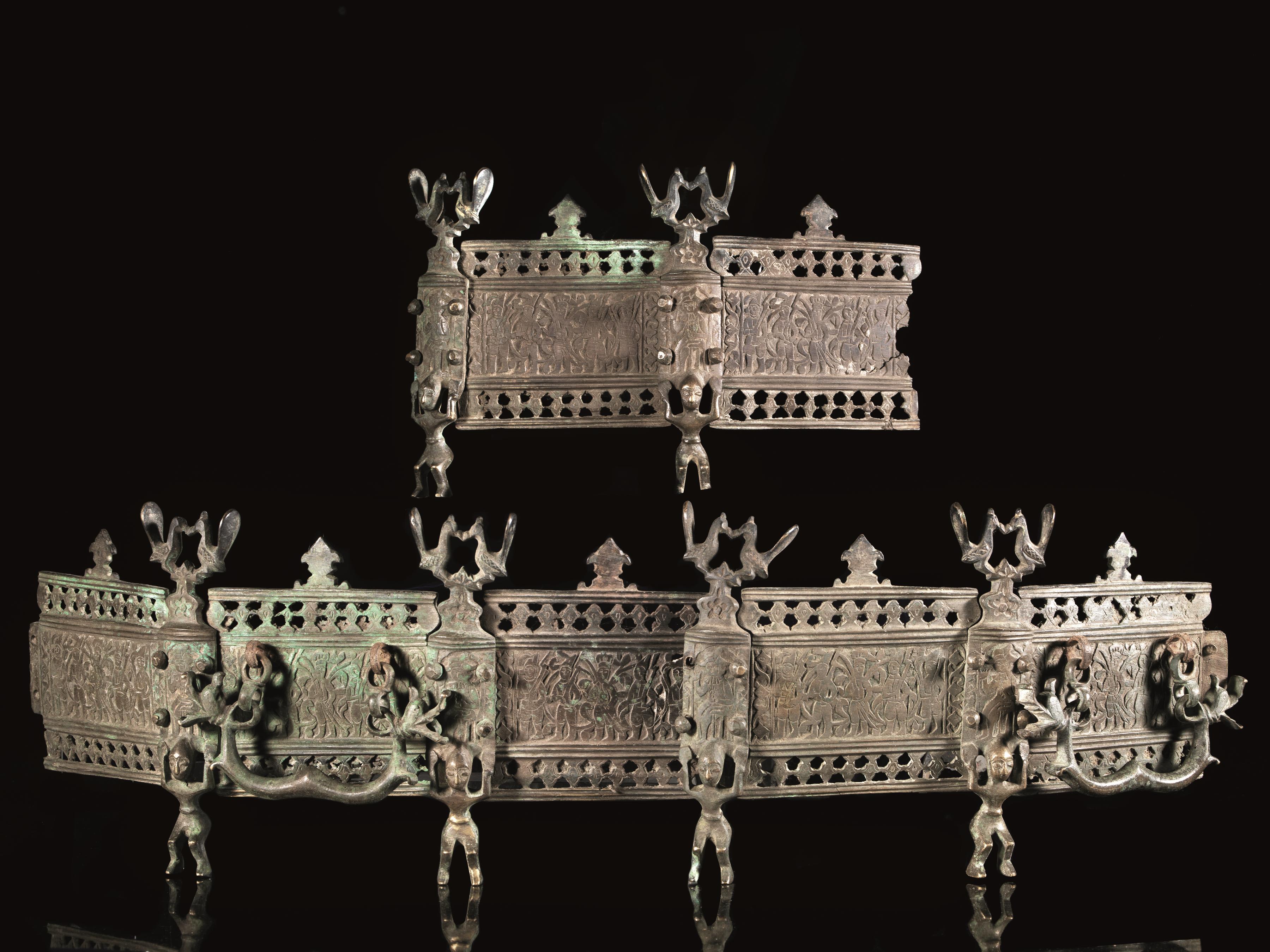 Tre frammenti pertinenti ad un braciere di forma ottagonale con bordo traforato superiormente e inferiormente e fascia centrale raffigurante un sovrano fra quattro uomini armati fra girali vegetali; sostegni decorati nella parte superiore con coppie di pavoncelle affrontate, nella fascia centrale con figura maschile seduta e zampe modellate a telamone, anse a draghi stilizzati