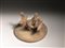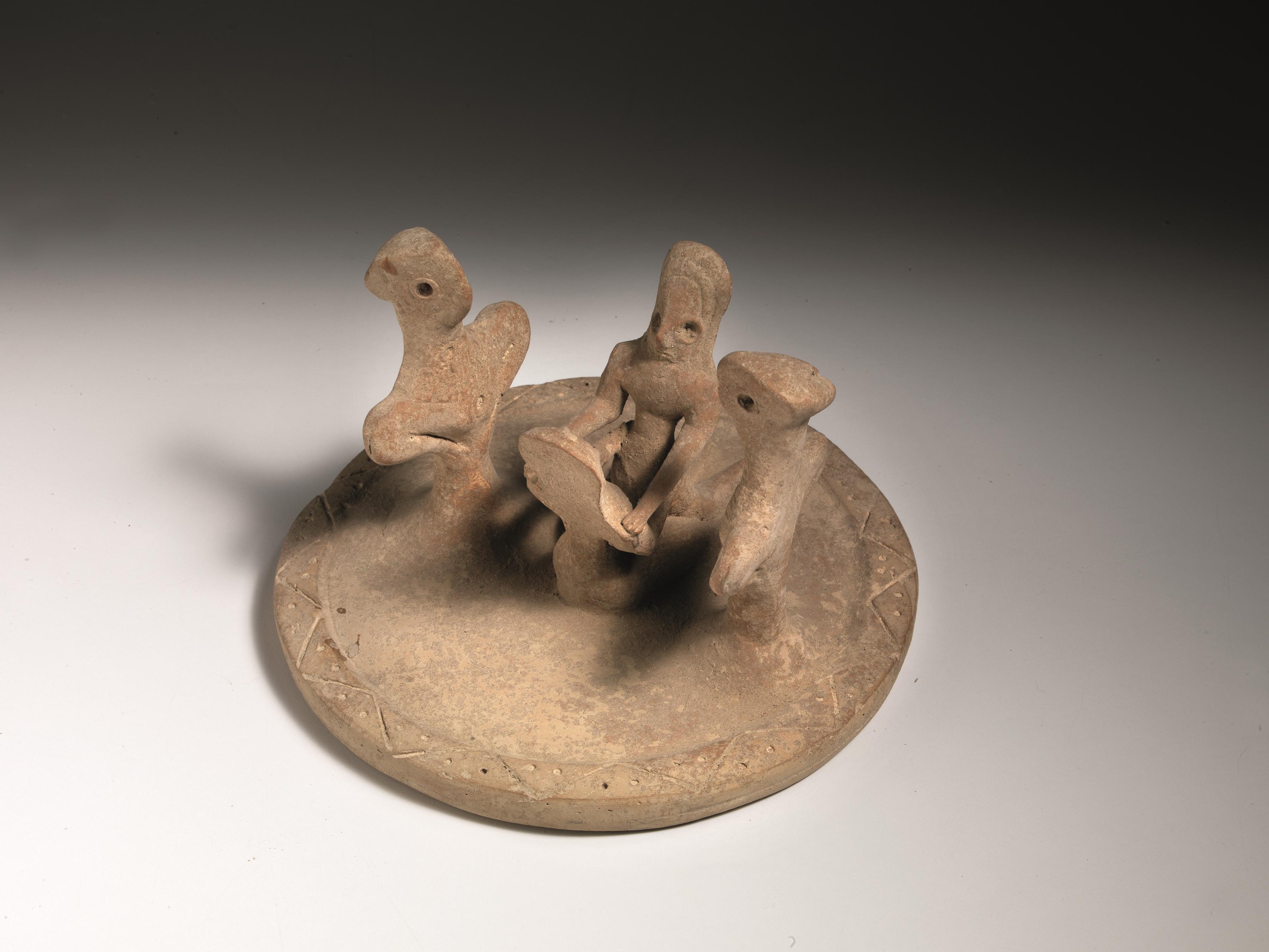 Modellino raffigurante una scena di culto con al centro due figure nude, una maschile e una femminile con collana, dalle teste stilizzate con becchi di uccello ed elaborate acconciature colte in un atto sessuale propiziatorio e fiancheggiate da due figure antropomorfe stanti con ampie spalle e mani sui fianchi, testa stilizzata con becco di uccello; su base circolare decorata sul bordo con motivo a zig-zag alternato a puntini impressi.