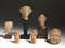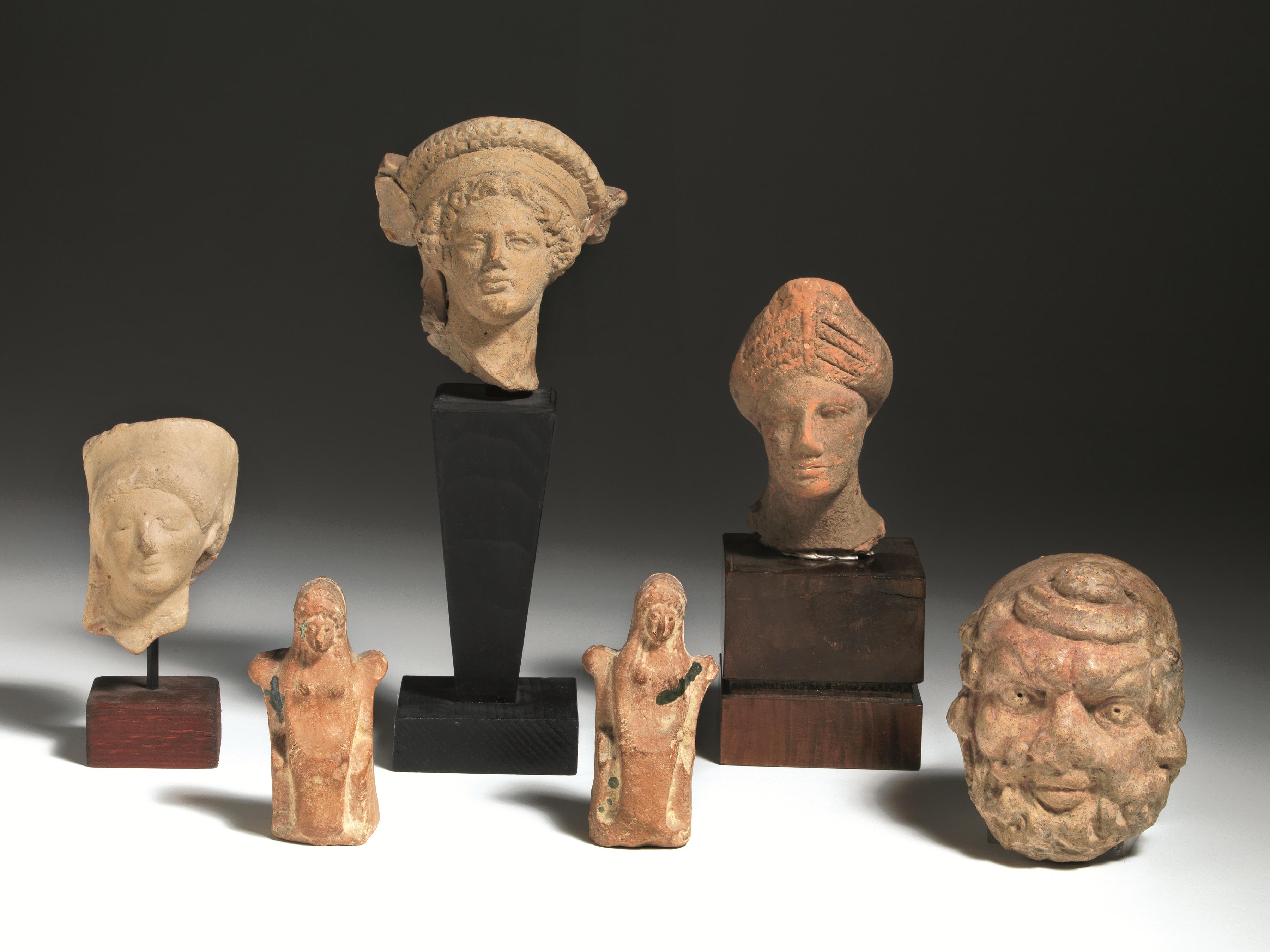 Testa di divinità femminile con alto polos e sorriso ionico; testa di giovane donna con i capelli riccamente acconciati in trecce riportate sulla fronte; due statuette di divinità assisa in trono con lunghe trecce che scendono fino al seno; bella testa maschile con folti riccioli che incorniciano il volto e con tenia e corona floreale; piccola maschera di satiro con zigomi sporgenti, grosso naso e folta barba (6)