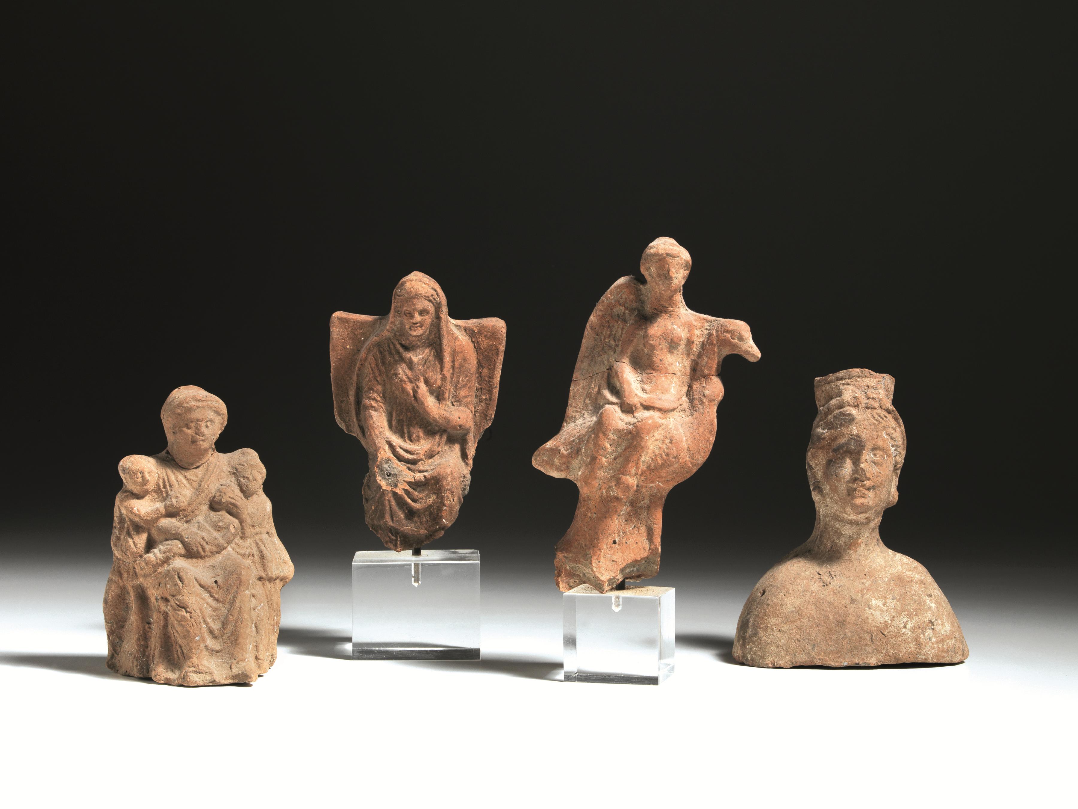 Statuetta di Leda sul cigno raffigurante la giovane nuda seduta all’amazzone sul dorso del cigno con le ali distese; statuetta di divinità seduta in trono in atto di allattare il bambino mentre altri due le si stringono ai fianchi; statuetta di divinità in trono con alto schienale, la dea è raffigurata con la testa velata, la mano sinistra portata al seno e la destra appoggiata sulle ginocchia; busto votivo di figura femminile stilizzata con alto polos sui capelli e corona di fiori (4)