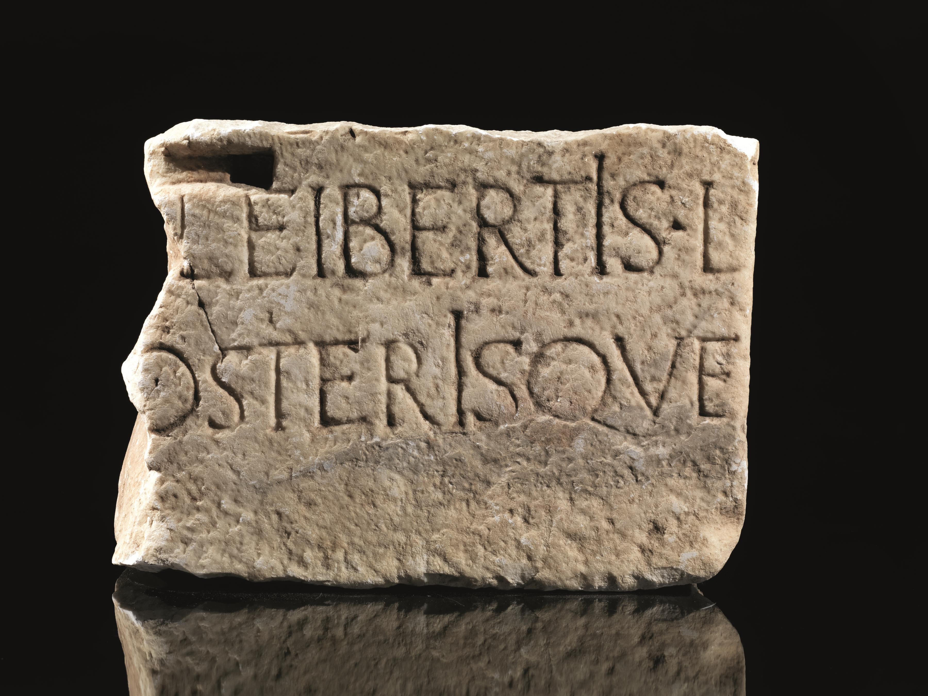 A) Frammento di forma pressoché quadrangolare in cui si conserva la parte destra di un corpo maschile nudo attaccato da un grande cinghiale; si tratta probabilmente del mito del cinghiale Calidonio che uccide il giovane Adone; B) frammento di basamento con bordo modanato su due lati riutilizzato in epoca successiva per una iscrizione funeraria: