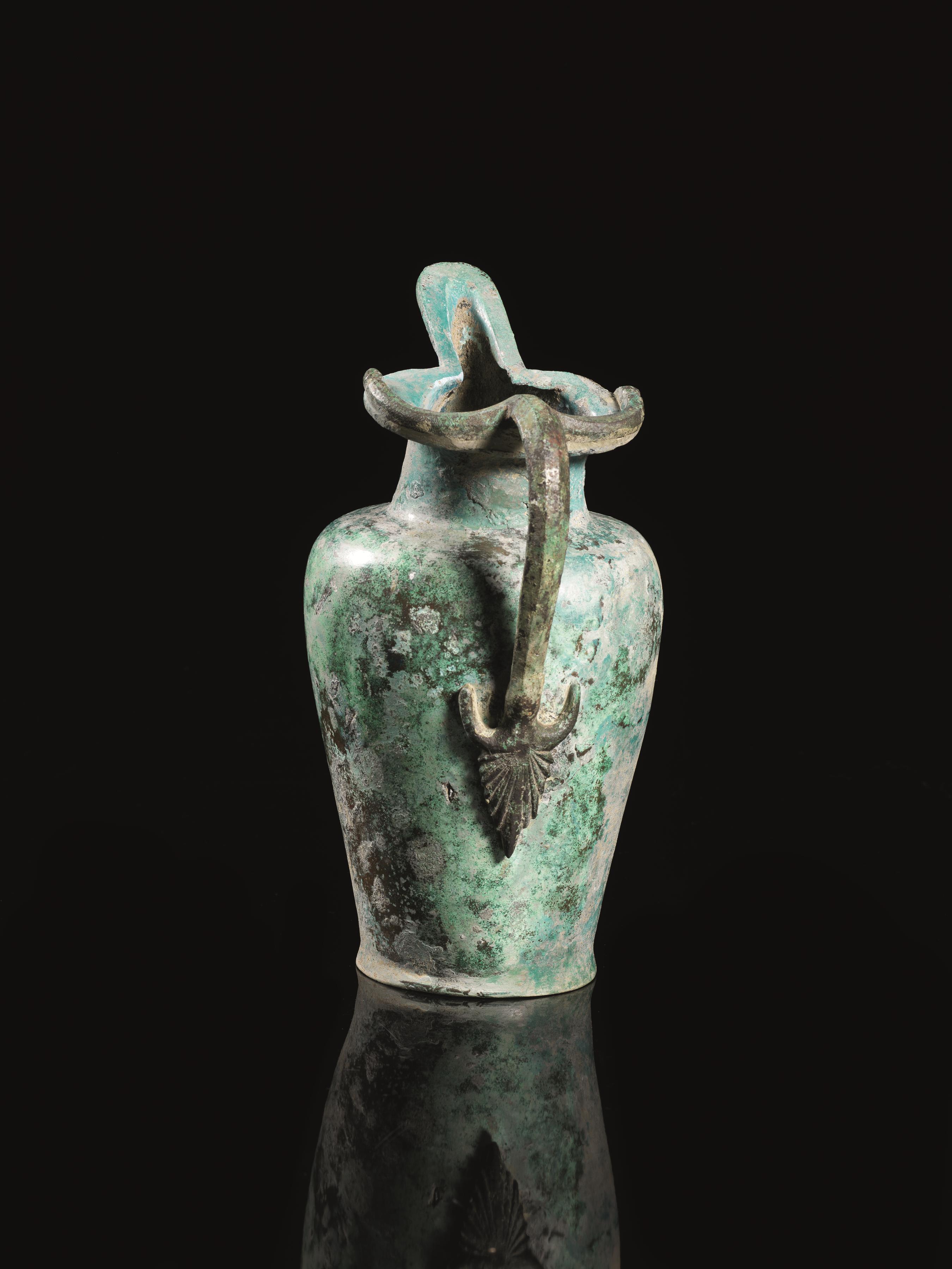 Materia e tecnica: lamina di bronzo martellata per il corpo; bronzo fuso e cesellato per l’ansa