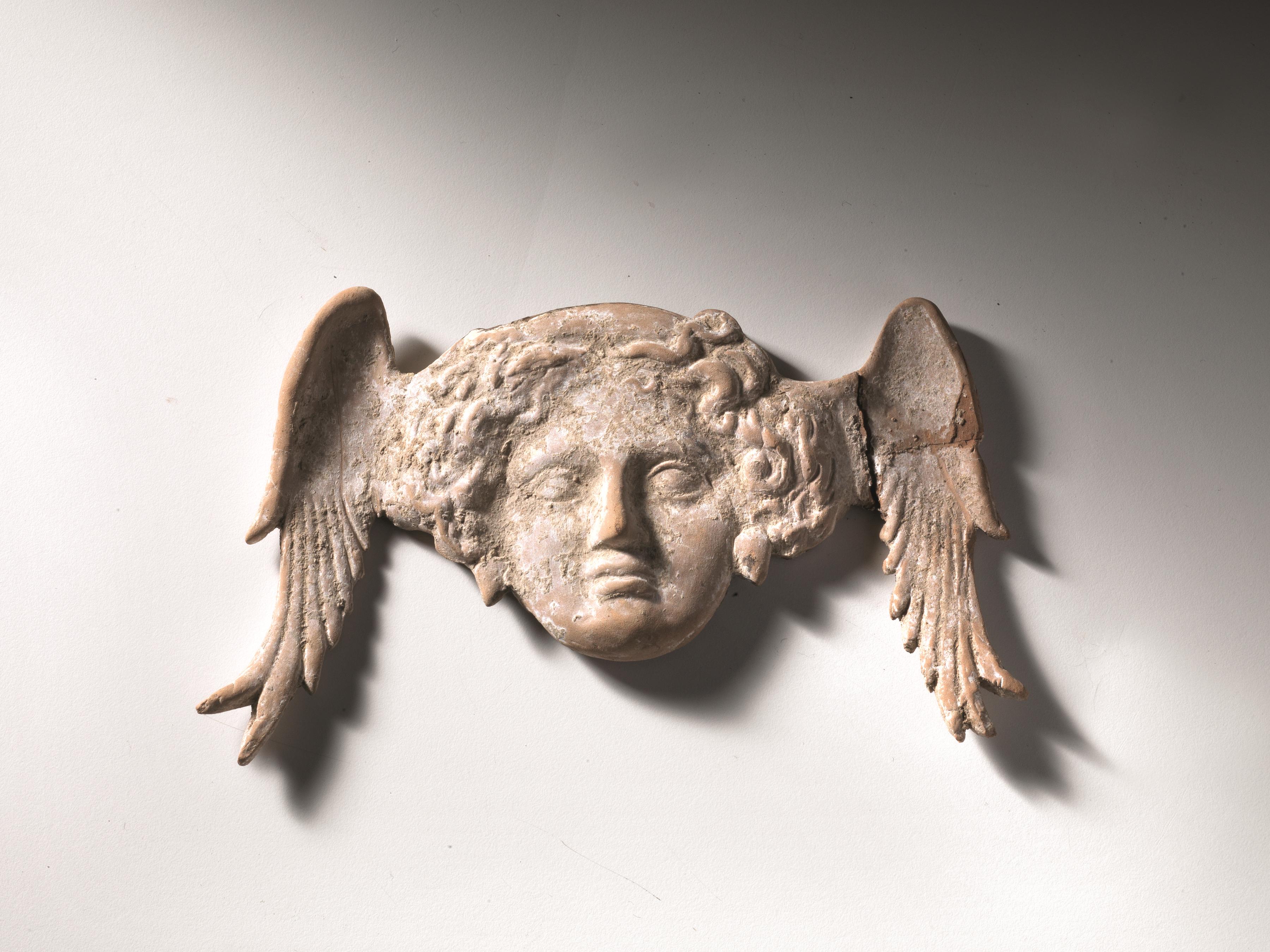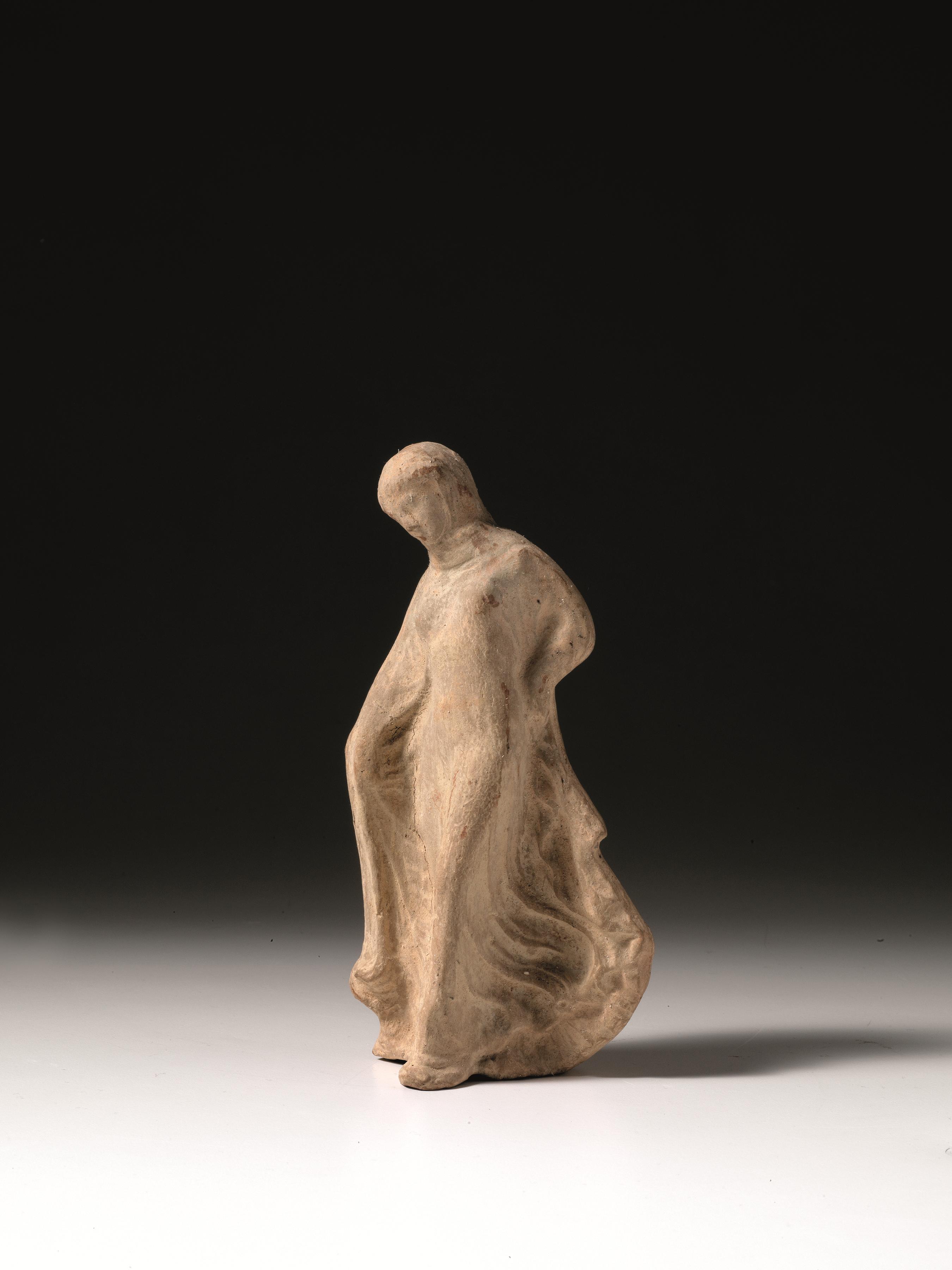 Statuetta di danzatrice con il capo velato e completamente avvolta nell’ himation , nell’atto di accennare un passo di danza che provoca il movimento a onda del mantello; applique per vaso con protome di Gorgone “di tipo calmo” con chioma a riccioli serpentiformi e ali ai lati della testa; entrambe le statuette presentano dettagli accurati indice di una matrice fresca (2)