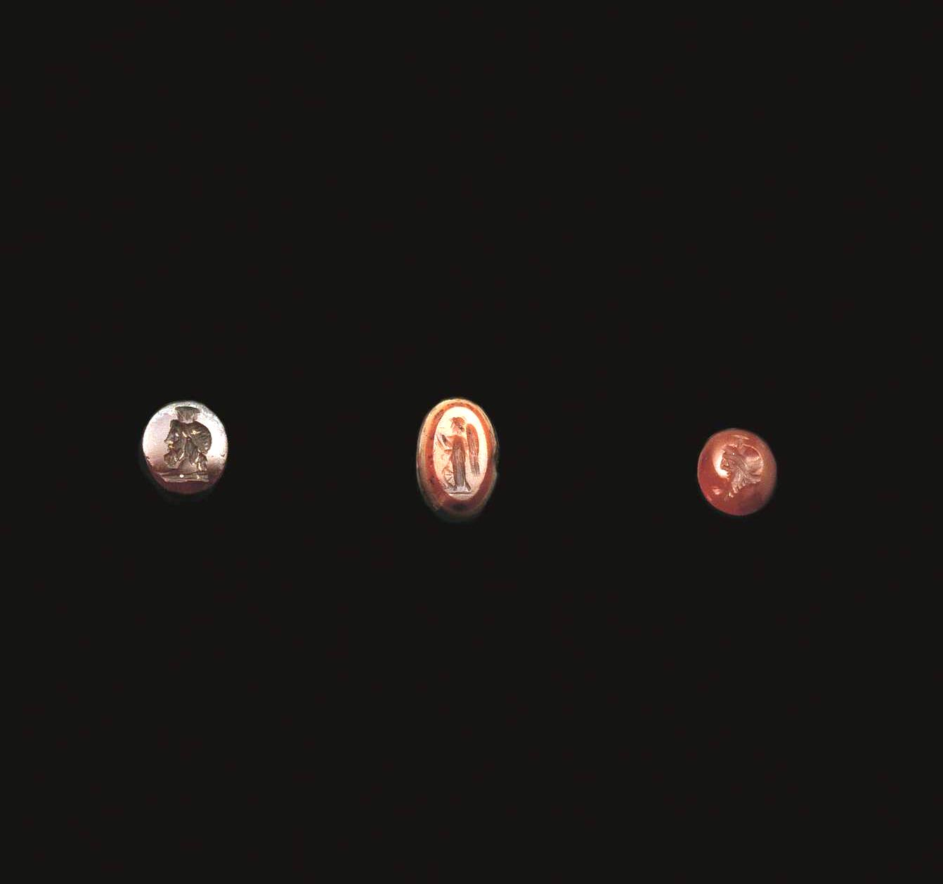 Tre castoni ellittici raffiguranti: di cui due con testa di Serapide con modio sulla testa volti a sinistra; Nemesi alta stante a destra con ramo e una ruota ai piedi (3)