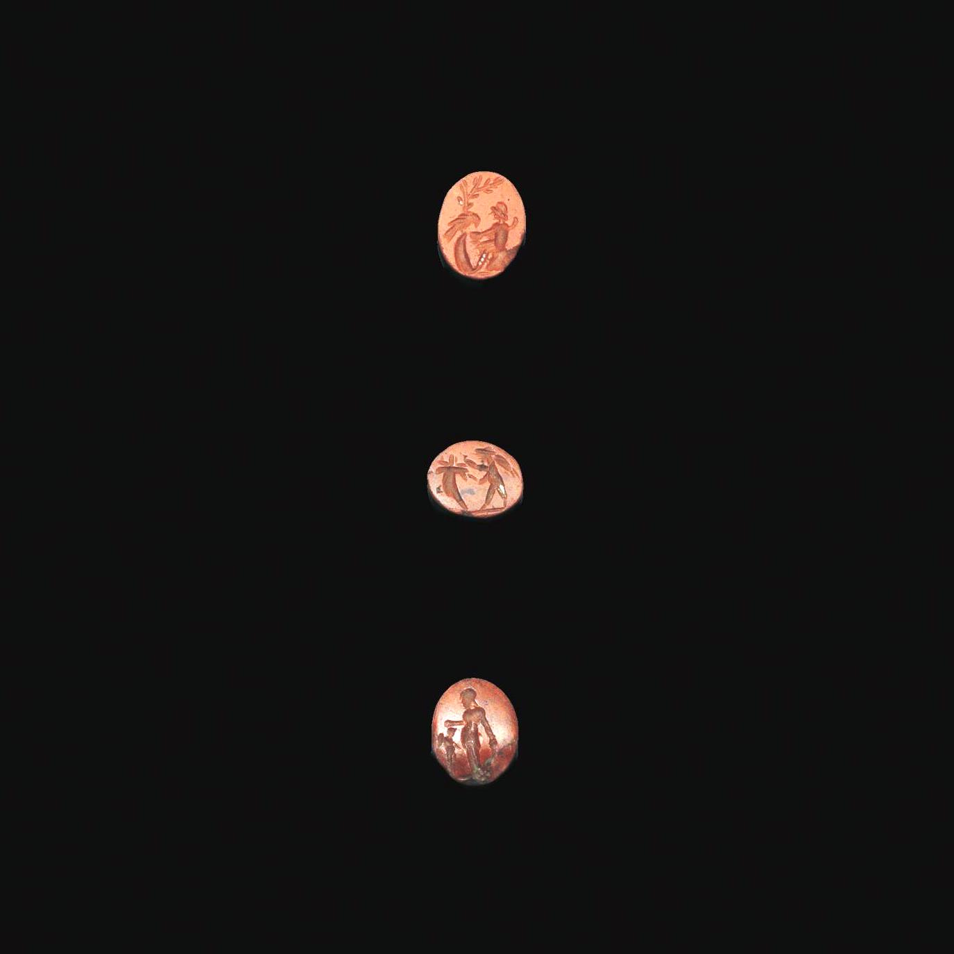 TRE GEMME INCISE Materia e tecnica: diaspro levigato ed inciso Tre castoni...