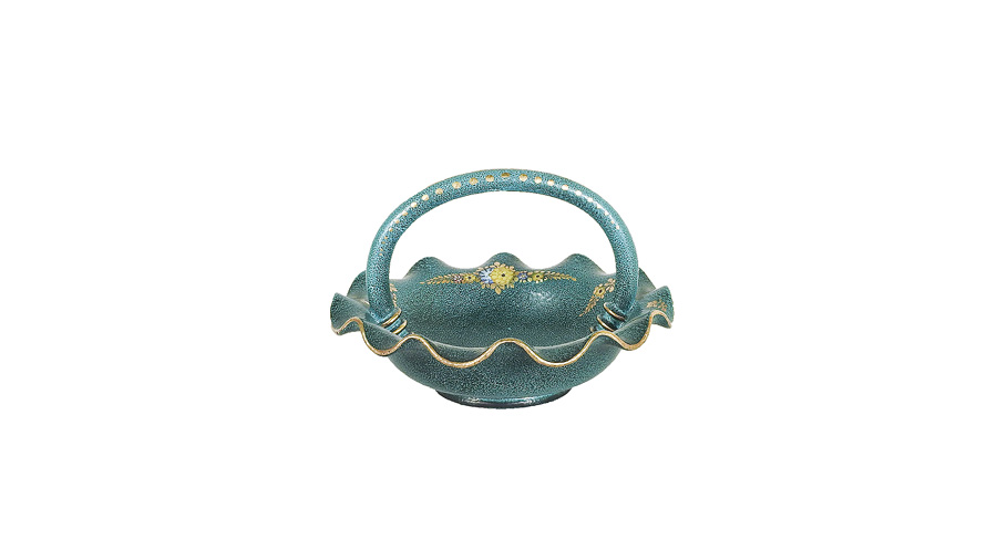 CESTINO IN TERRACOTTA SMALTATA Manifattura Deruta, Anni Cinquanta bordo mosso, dipinto con motivi floreali policromi e lumeggiature in oro su fondo verde GLAZED TERRACOTTA BASKET, DERUTA, 1950S