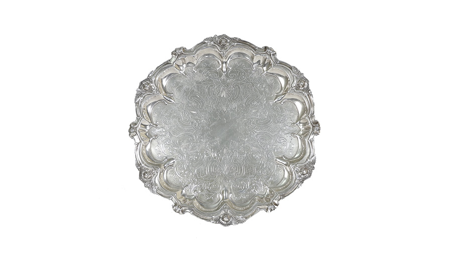 SALVER IN SHEFFIELD bordo sagomato sbalzato con rose e volute, su tre piedini a ricciolo diam cm 32 SHEFFIELD SALVER
