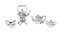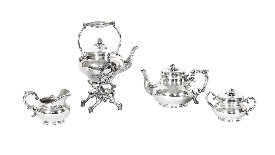 SERVITO DA TE IN METALLO ARGENTATO Milano, Broggi coperchi con presa a foggia di melograno, composto da samovar, teiera, lattiera e zuccheriera (4) SILVER-PLATED TEA SET, MILAN, BROGGI
