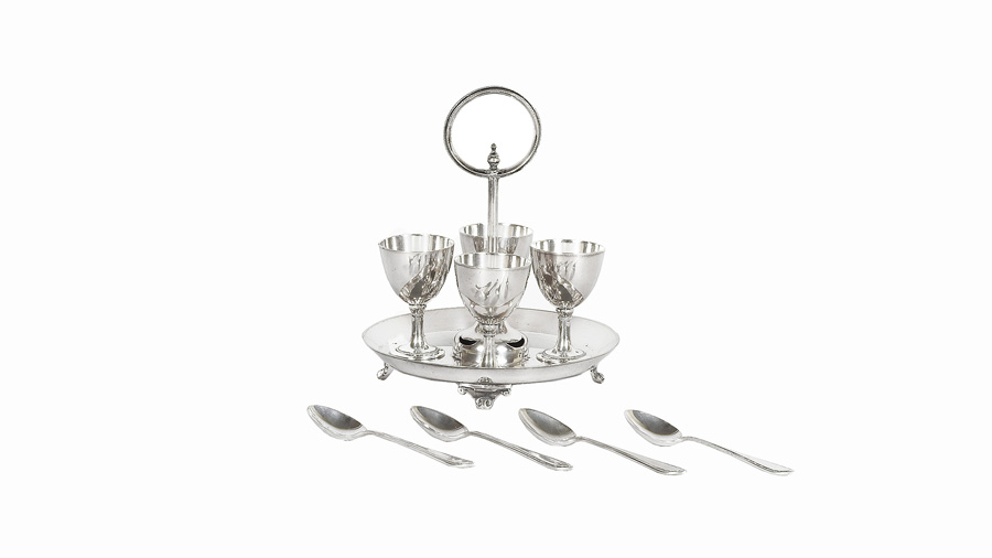 SET PORTAUOVO IN SHEFFIELD completo di cucchiaini, presa centrale a cerchio, base rotonda su quattro piedini a ricciolo SHEFFIELD EGG CUP SET