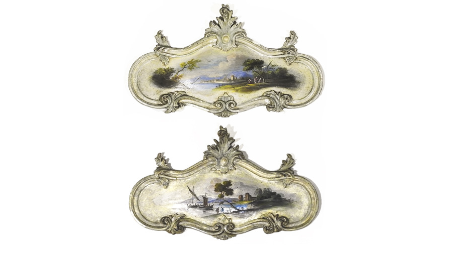 COPPIA DI SOVRAPPORTA in legno intagliato e laccato bianco di forma sagomata, dipinti con paesaggi di gusto settecentesco cm 50x70 PAIR OF LACQUERED AND PAINTED WOOD FRIEZES