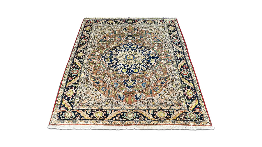 TAPPETO PERSIANO SARUGH vecchia manifattura con colori vegetali naturali, fondo cammello, campo con motivi floreali multicolori, medaglione centrale e bordura blu notte cm 191x145 PERSIAN SARUGH CARPET