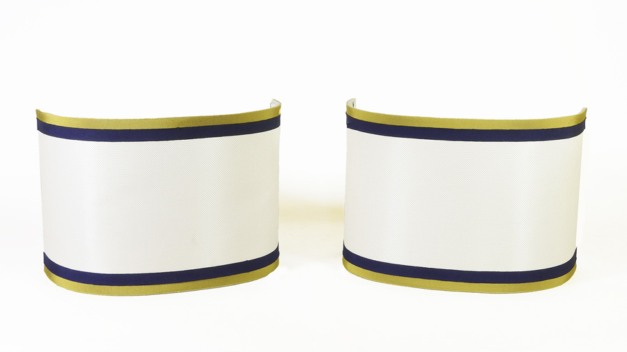 COPPIA DI VENTOLE-APPLIQUES in tela avorio con bordi nei toni del blu e del giallo oro cm 26x36,5 PAIR OF WALL LAMPS