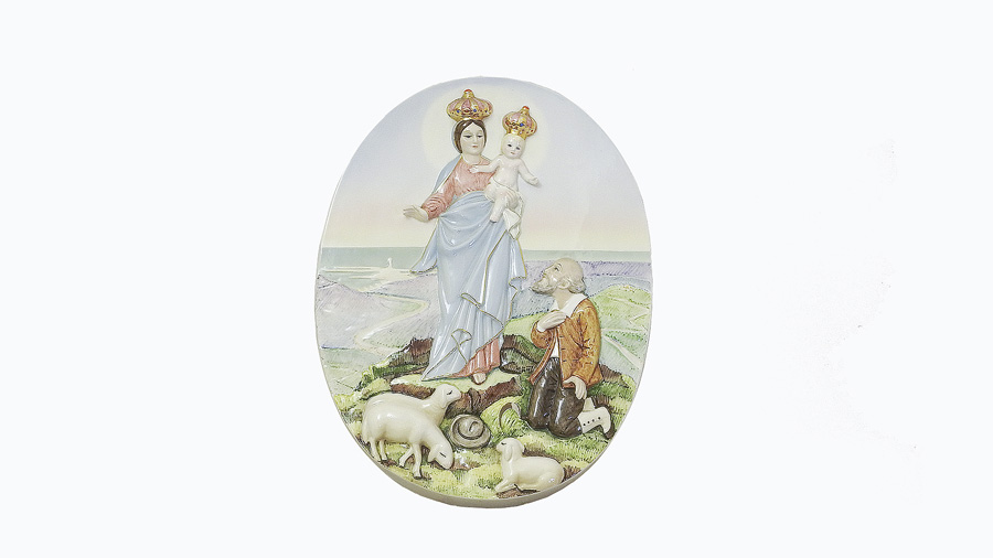 ANTONIO RONZAN (1914-1985) Placca ovale a bassorilievo in ceramica policroma raffigurante Madonna con Bambino incoronati e pastore cm 40x31 Marcata: Originale ARonzan Torino n. 770 OVAL PORCELAIN PLAQUE WITH MADONNA AND THE CHILD