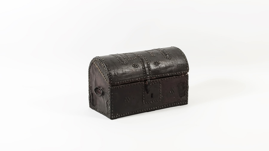PICCOLO FORZIERE IN LEGNO RIVESTITO IN CUOIO Toscana, XVIII secolo decorato...