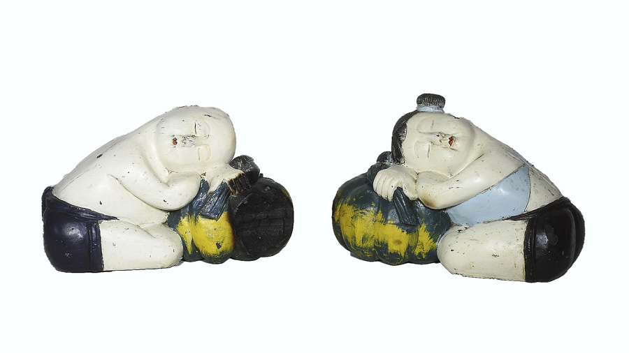 COPPIA DI FIGURE ORIENTALI IN LEGNO LACCATO raffiguranti due bambini con zucche, difetti h cm 27x46x21 PAIR OF LACQUERED WOODEN ORIENTAL FIGURES