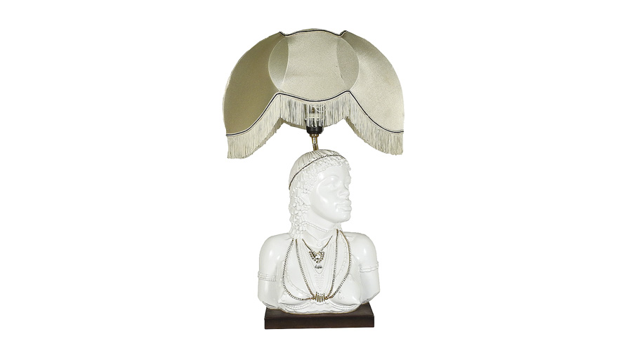 DOMENICO POLONIATO (1926-2013) Busto di abissina in ceramica lumeggiature in oro, su base in rame, firmato, montato a lume e corredato da paralume con frange, lievi difetti h cm 45 CERAMIC ABYSSINIAN FEMALE BUST