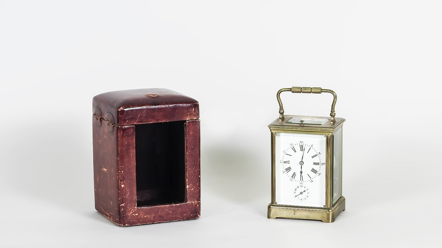 Lotto 65 | UFFICIALINA IN BRONZO ENTRO SCATOLA IN CUOIO BRONZE TABLE CLOCK
