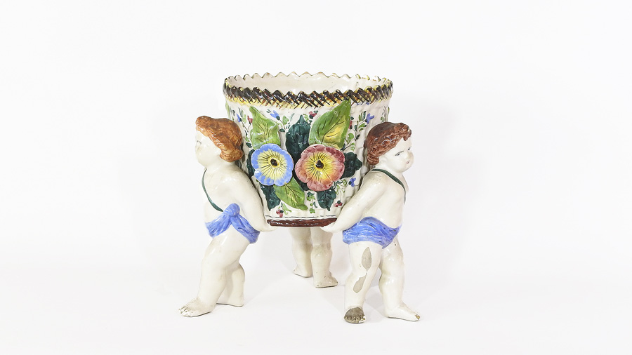CACHEPOT IN TERRACOTTA SMALTATA realizzato come un vaso decorato con fiori policromi a rilievo, sorretto da tre puttini, difetti h cm 28 GLAZED TERRACOTTA CACHEPOT