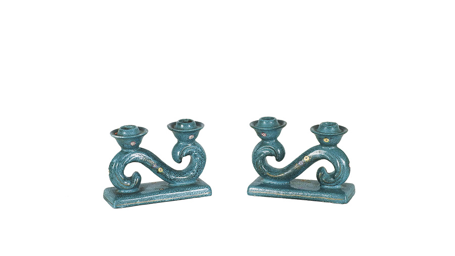 COPPIA DI CANDELABRI IN TERRACOTTA SMALTATA IN RAMINA Manifattura Deruta, Anni Cinquanta due bracci portacandela a doppia voluta, dipinti con motivi floreali policromi e lumeggiature in oro su fondo verde, lievi difetti h cm 11 PAIR OF GLAZED TERRACOTTA CANDELABRA, DERUTA, 1950S
