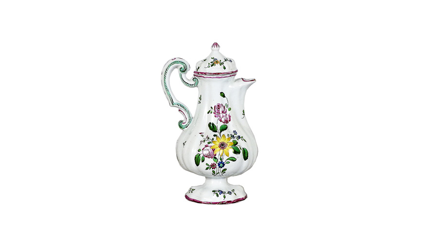 CAFFETTIERA IN MAIOLICA Pesaro, fine del XIX/inizio del XX secolo corpo piriforme, ansa laterale sagomata, dipinta con rose e altri fiori policromi, lievissimi difetti h cm 26,5 MAJOLICA COFFEE POT, PESARO, LATE 19TH/EARLY 20TH CENTURY