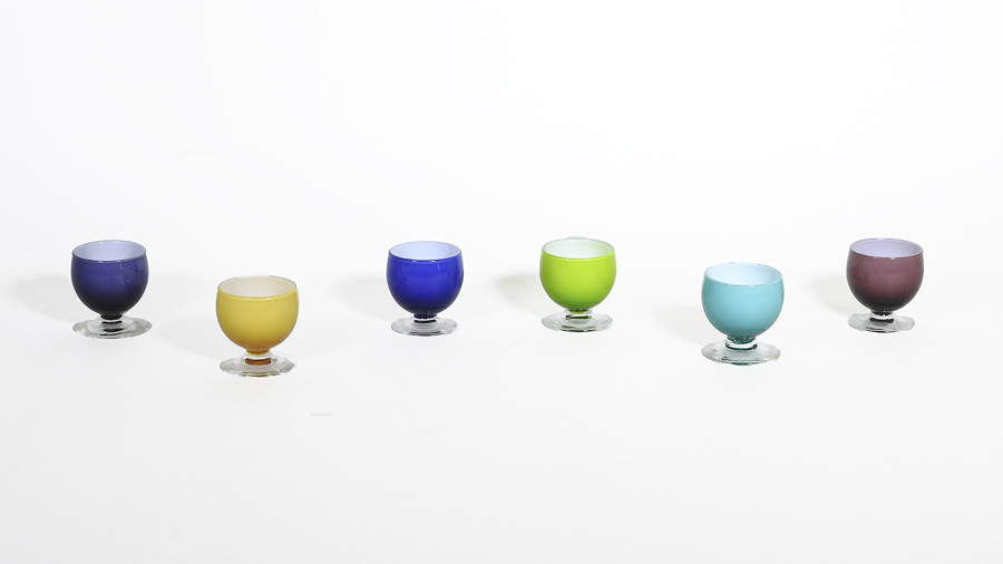 SERIE DI DODICI PORTAUOVO IN VETRO DOPPIO Rigatti di differenti colori, entro scatole originali Firma incisa sotto la base A SET OF TWELVE GLASS EGG CUPS