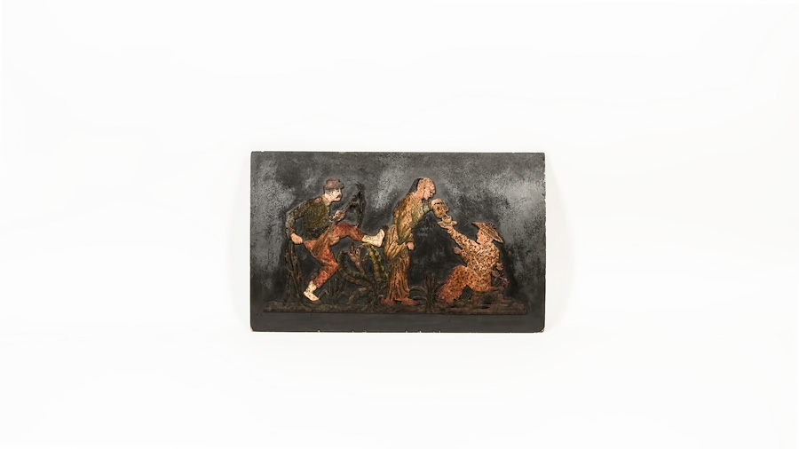 PANNELLO TRAFORATO E INCISO IN LEGNO LACCATO raffigurante scena con personaggi orientali e militare, applicato a pannello di supporto cm 24,5x40,5 LACQUERED WOOD PANEL WITH MILITARY SCENE