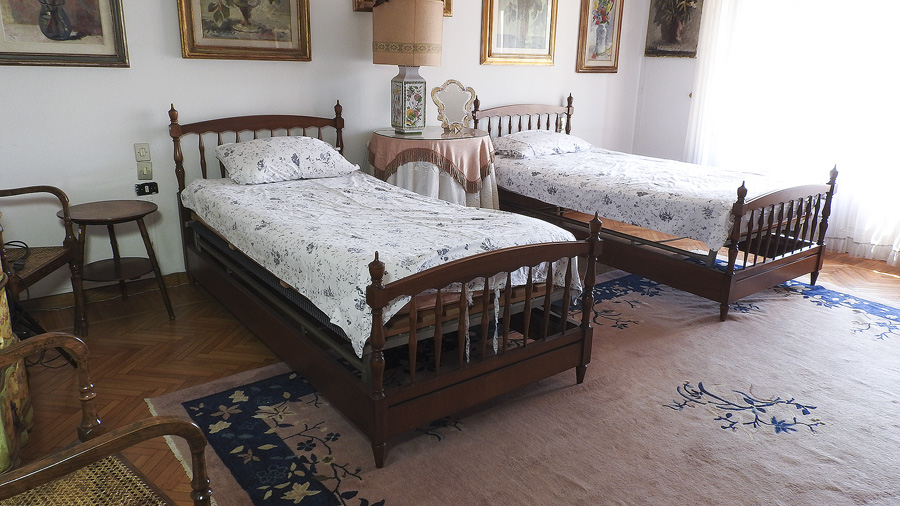 COPPIA DI LETTI SINGOLI IN NOCE testiera e pediera con stecche verticali, montanti torniti PAIR OF WALNUT SINGLE BEDS
