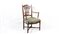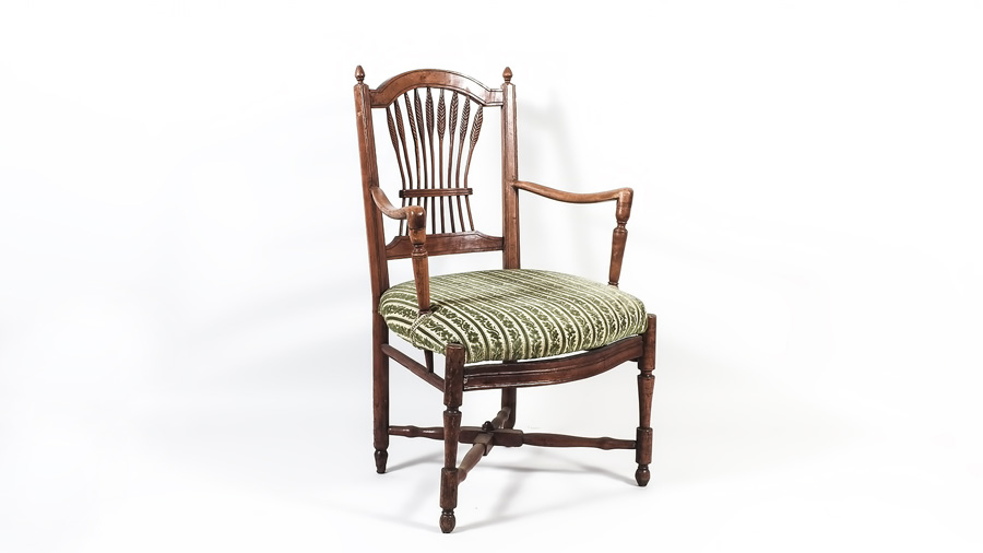 POLTRONCINA IN NOCE inizio del XX secolo schienale con finali a pigna, cartella traforata con spighe di grano, braccioli a giorno mossi, gambe tornite, seduta imbottita e rivestita in velluto verde con motivi floreali WALNUT ARMCHAIR, EARLY 20TH CENTURY
