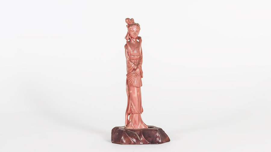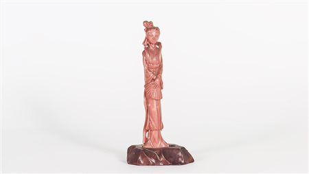 QUANIN CON VENTAGLIO IN CORALLO Cina, inizio del XX secolo su base in tek h cm 14,5 CORAL FIGURE OF A QUANIN WITH FAN, CHINA, EARLY 20TH CENTURY
