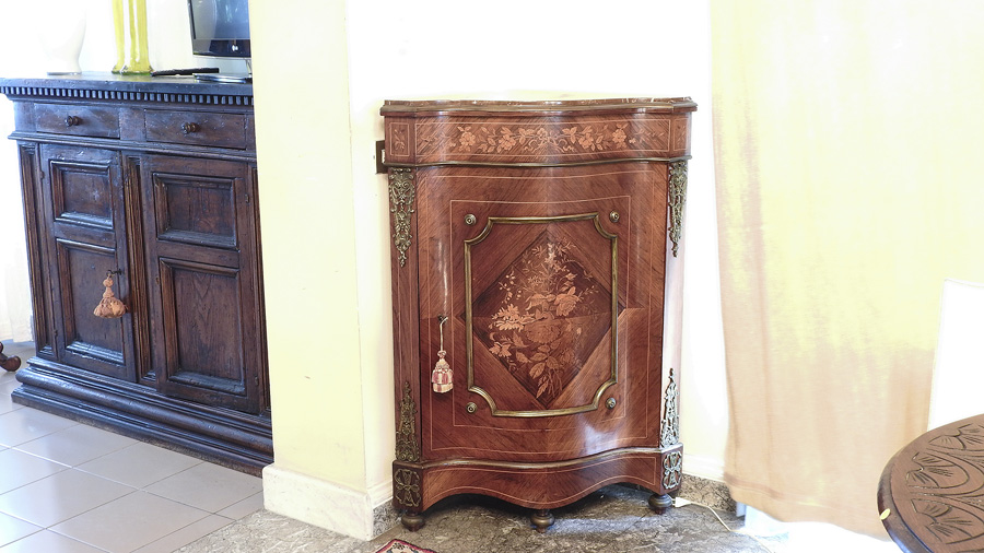 ANGOLIERA IMPIALLACCIATA IN NOCE XX secolo intarsiata in legno di rosa con...