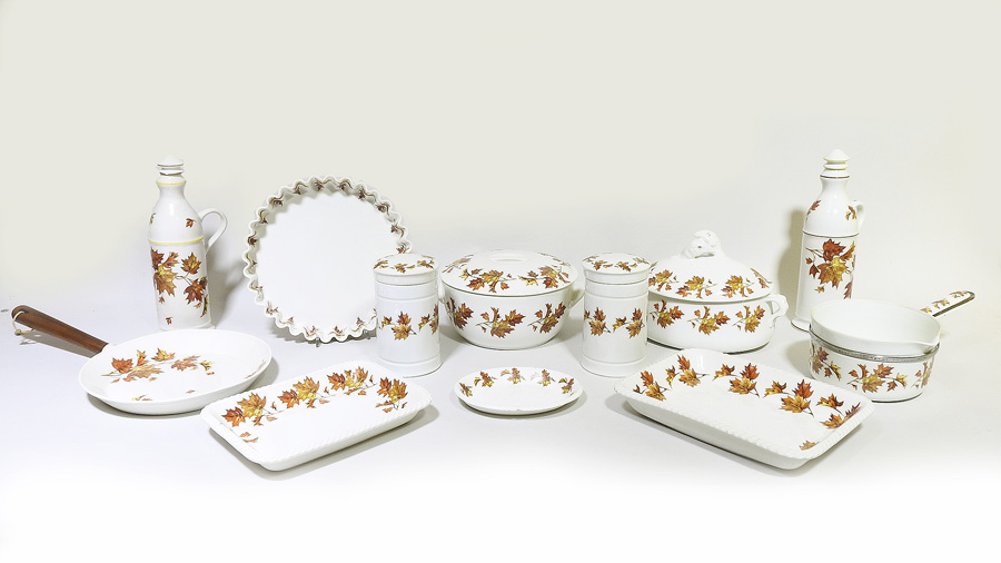 SERVITO DA CUCINA IN PORCELLANA LIMOGES decorato con foglie autunnali composto da numerose terrine da fuoco, pirofile, zuppiere, barattoli e flaconi (20) PORCELAIN KITCHEN SET, LIMOGES