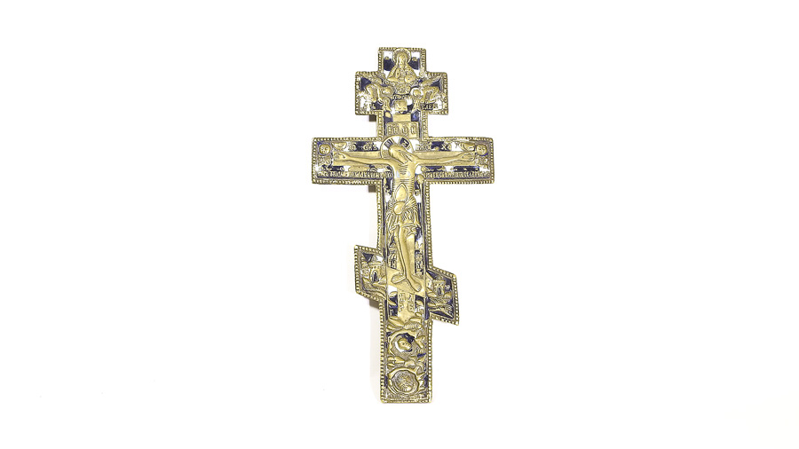 CROCE RUSSA ORTODOSSA IN BRONZO E SMALTI XIX secolo iscrizioni in cirillico cm 34x17,5 BRONZE AND ENAMEL RUSSIAN ORTHODOX CROSS, 19TH CENTURY