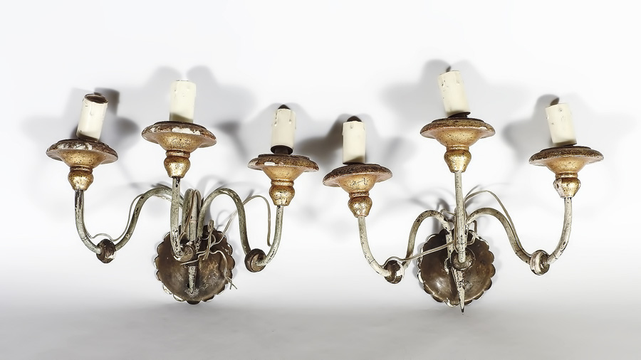 COPPIA DI APPLIQUES IN METALLO LACCATO E LEGNO DORATO Toscana, fine del XVIII secolo tre bracci portacandela ciascuna, lievi difetti h cm 22 PIR OF LACQUERED METAL AND GILTWOOD WALL LAMPS, TUSCANY, LATE 18TH CENTURY