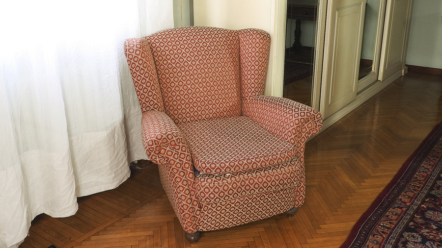 POLTRONA IMBOTTITA E RIVESTITA IN TESSUTO BORDEAUX CON MOTIVI FLOREALI NEI...
