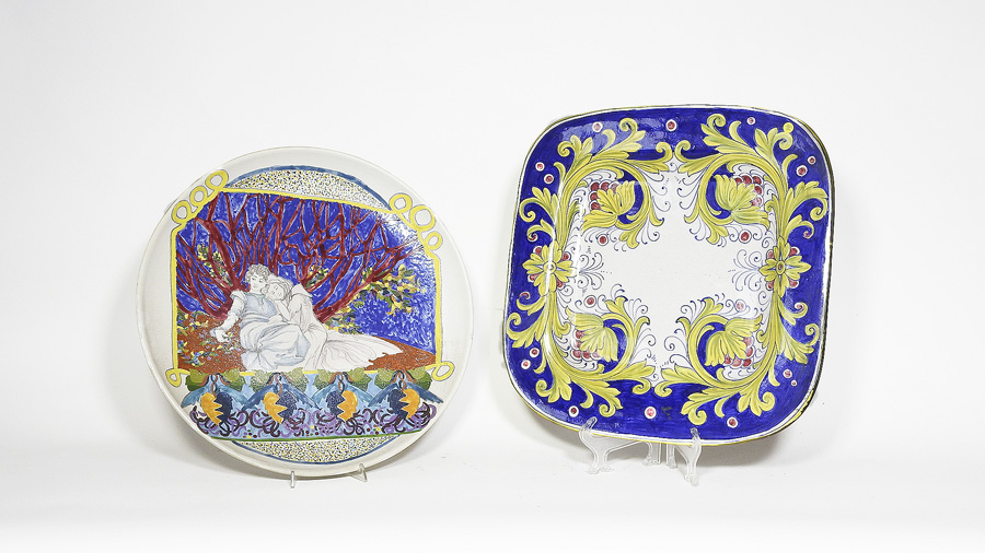 DUE PIATTI DA PARATA IN TERRACOTTA SMALTATA uno quadrato Deruta dipinto con...
