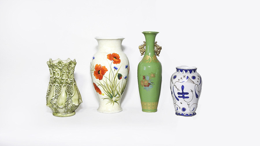 QUATTRO VASI IN TERRAGLIA E CERAMICA tra cui uno dipinto con papaveri ed uno decorato con motivi floreali nei toni del verde FOUR POTTERY AND CERAMIC VASES