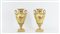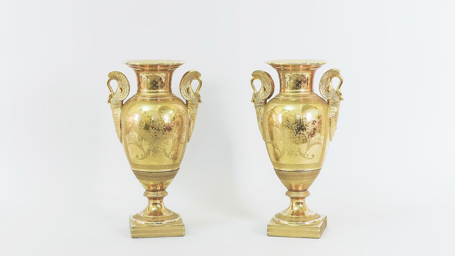 COPPIA DI VASI IN PORCELLANA realizzati in stile impero, corpo ad ogiva decorato con volute e motivi floreali, anse laterali a foggia di cigno, su base quadrata h cm 36,5 PAIR OF GILDED PORCELAIN VASES