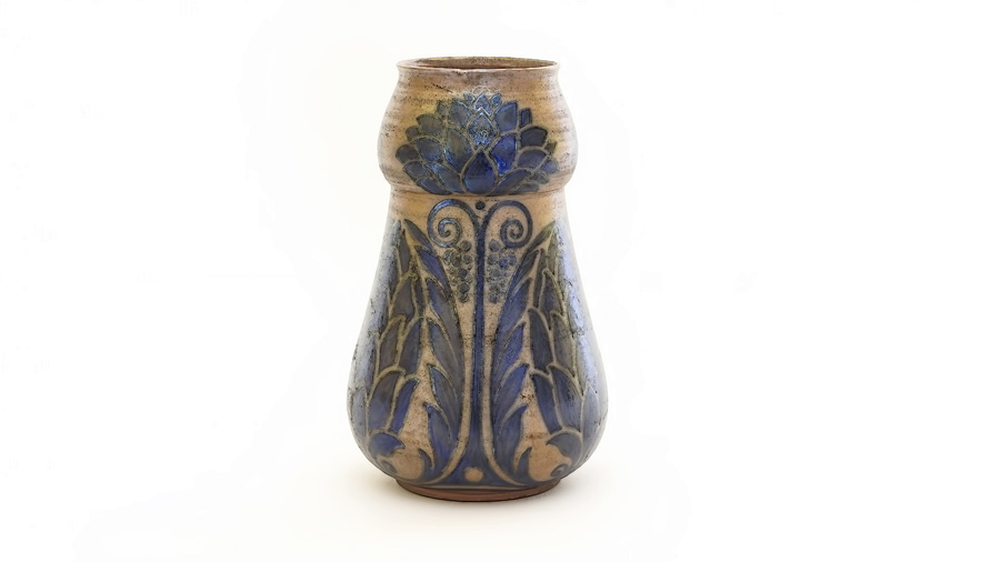 VASO IN GRÈS SALATO Galileo Chini, Fornaci di San Lorenzo 1919-1940 ca dipinto a lustro in monocromia blu con palmette, motivi floreali e bacche h cm 24,7 lieve difetto di cottura sul bordo Reca marchio ''Grata entro cerchio'' Chini e Co Mugello (Italia) e numero: 52 (poco leggibile)/2078 Stoneware Vase, Galileo Chini, Fornaci di San Lorenzo, 1919-1940 ca, stamped signature under the base