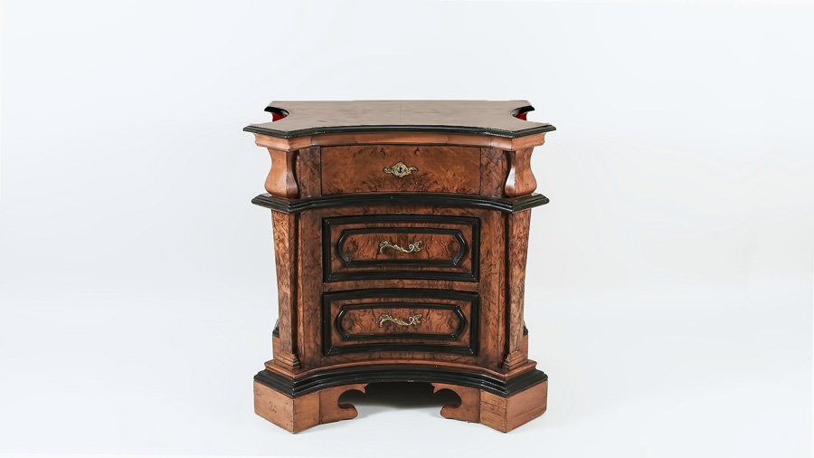 PICCOLO CASSETTONE IMPIALLACCIATO IN RADICA DI NOCE piano sagomato, angoli...
