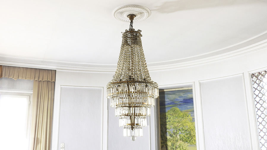 GRANDE LAMPADARIO IN METALLO DORATO E CRISTALLO realizzato in stile impero, con catene di perle in cristallo e pendenti, alcune mancanze h cm 150 LARGE GILDED METAL AND CRYSTAL CHANDELIER