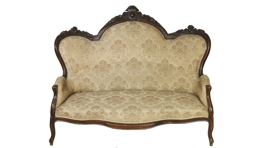 COPPIA DI DIVANETTI IN NOCE metà del XIX secolo schienale sagomato con cimasa intagliata, gambe mosse, imbottiti e rivestiti in tessuto floreale nei toni del beige e del rosa lungh cm 156 PAIR OF WALNUT SOFA, MID 19TH CENTURY